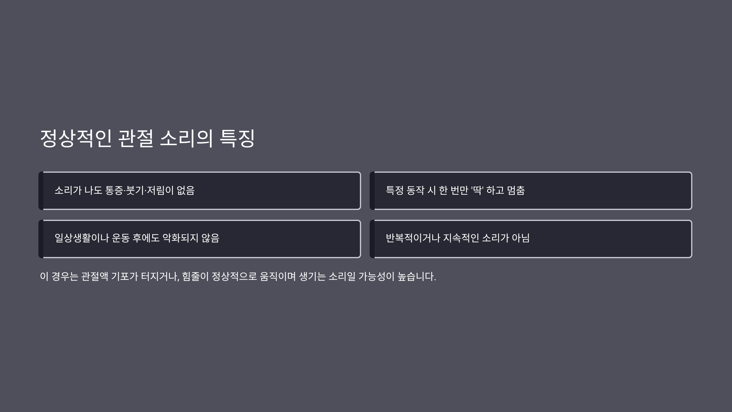 이 경우는 관절액 기포가 터지거나, 힘줄이 정상적으로 움직이며 생기는 소리일 가능성이 높습니다.