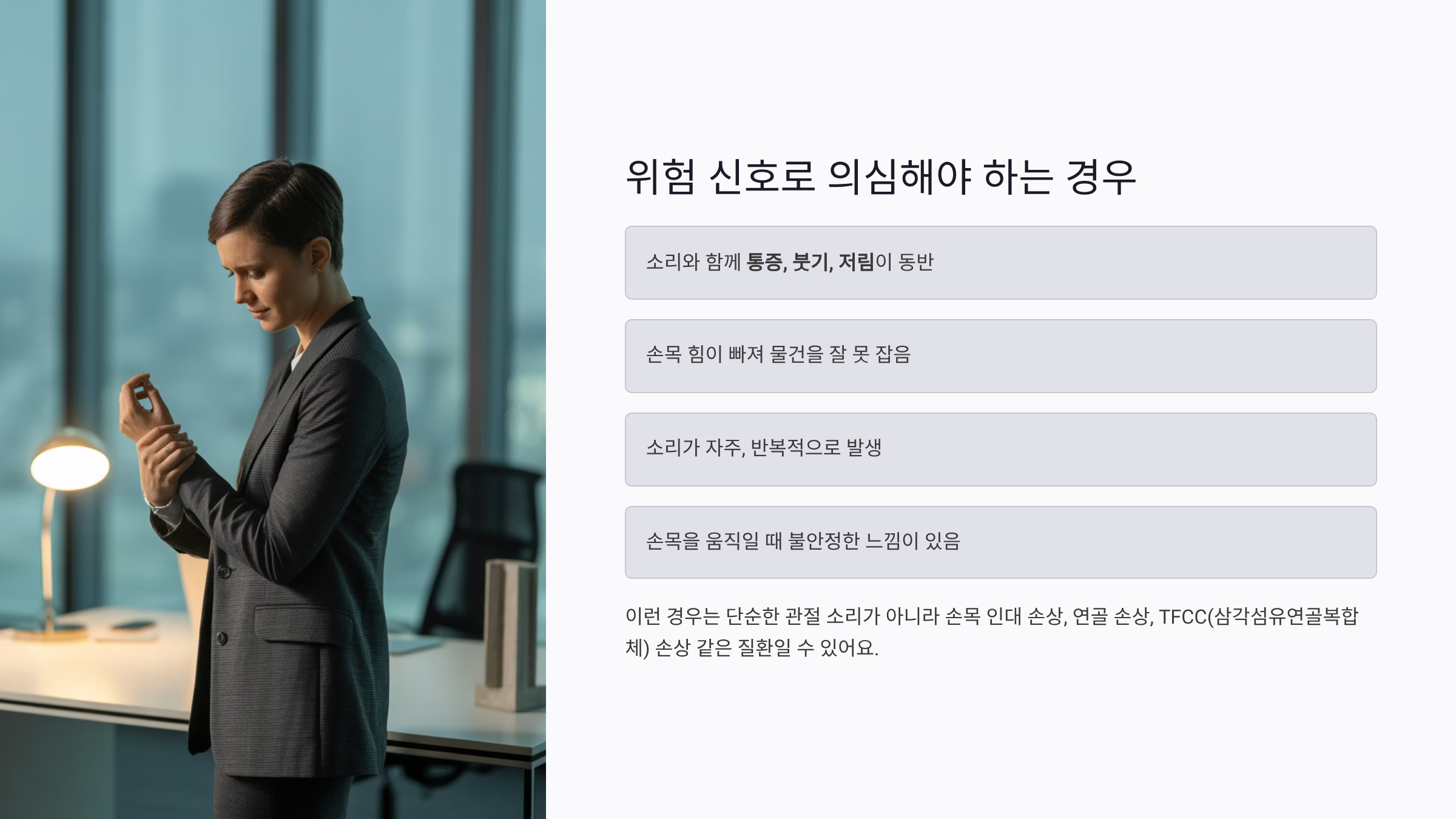 이런 경우는 단순한 관절 소리가 아니라 손목 인대 손상, 연골 손상, TFCC(삼각섬유연골복합체) 손상 같은 질환일 수 있어요.