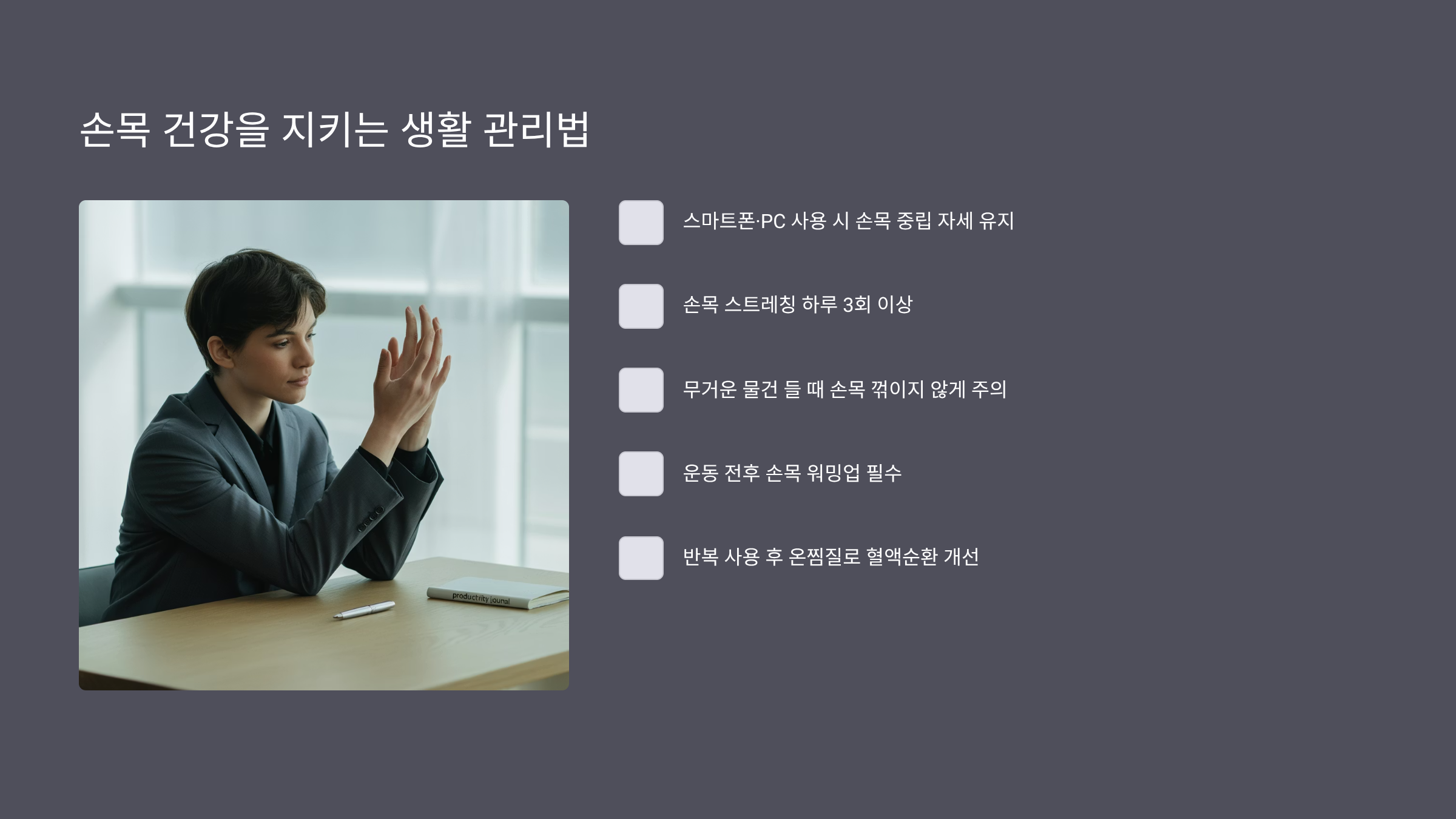 - 스마트폰·PC 사용 시 손목 중립 자세 유지