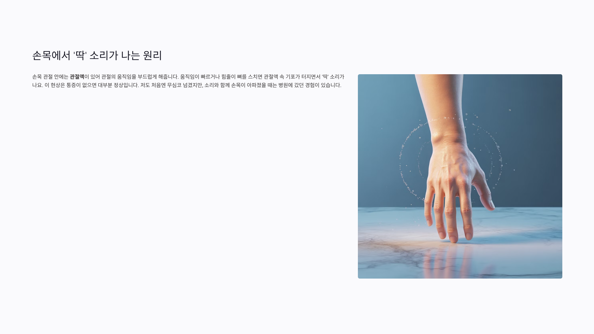 손목 관절 안에는 관절액이 있어 관절의 움직임을 부드럽게 해줍니다. 움직임이 빠르거나 힘줄이 뼈를 스치면 관절액 속 기포가 터지면서 ‘딱’ 소리가 나요. 이 현상은 통증이 없으면 대부분 정상입니다. 저도 처음엔 무심코 넘겼지만, 소리와 함께 손목이 아파졌을 때는 병원에 갔던 경험이 있습니다.