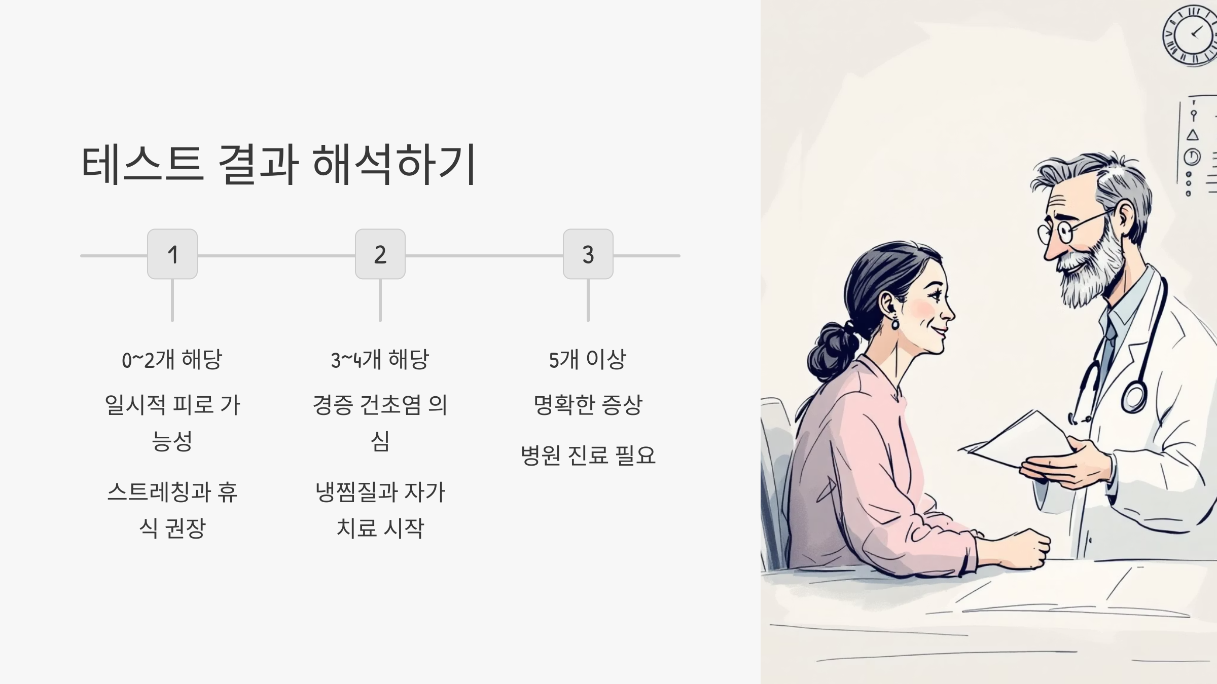 - 3~4개 해당: 경증 건초염 의심. 냉찜질과 가벼운 자가치료 시작