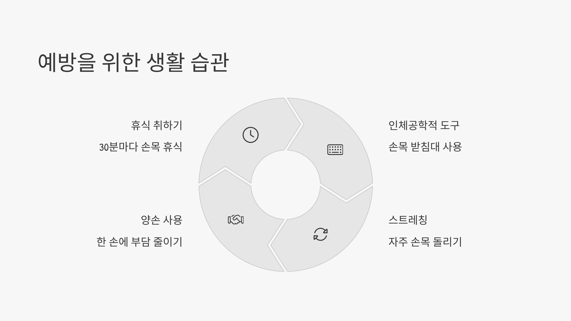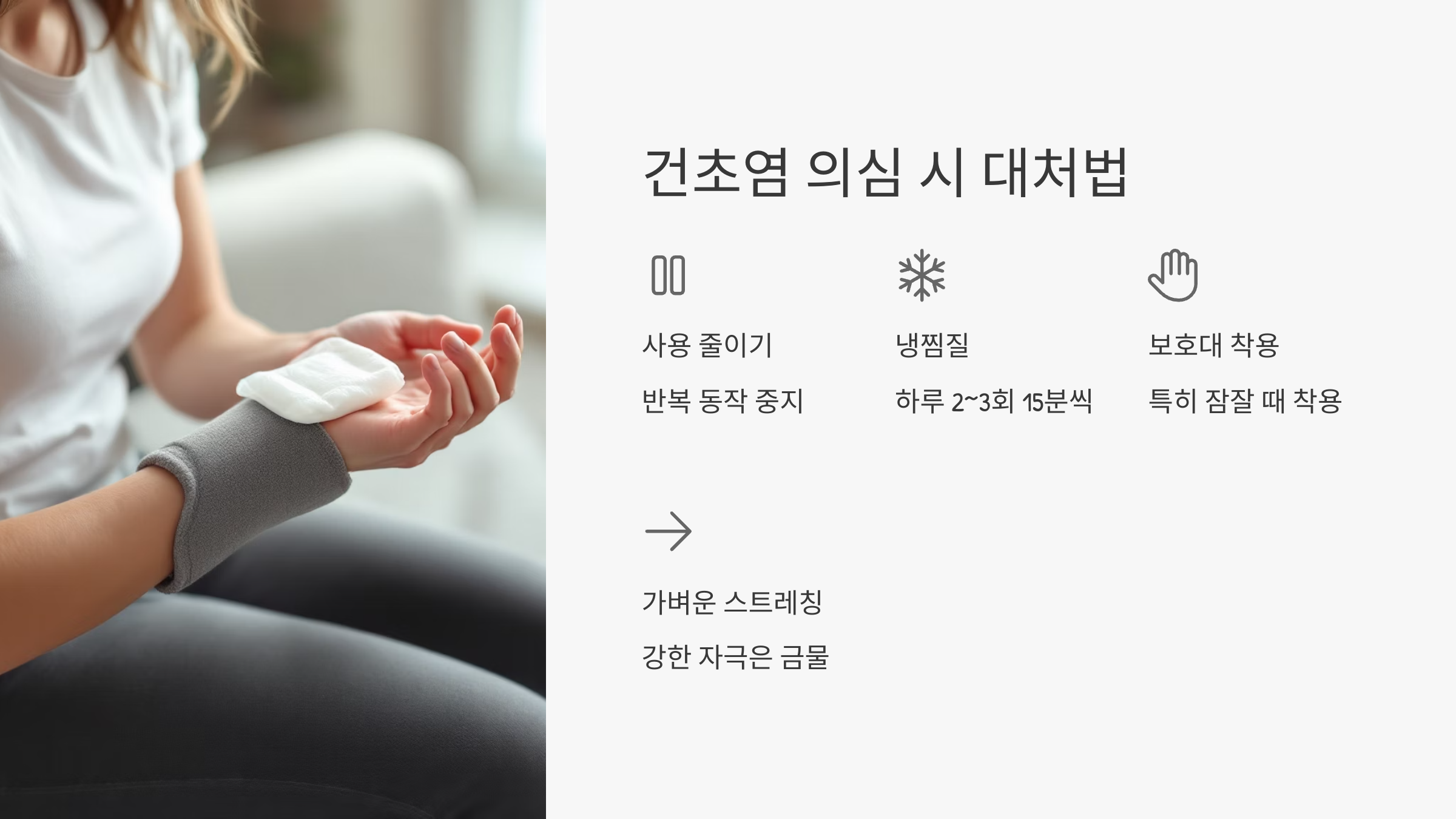 - 손목 사용 줄이기 (특히 반복 동작 중지)