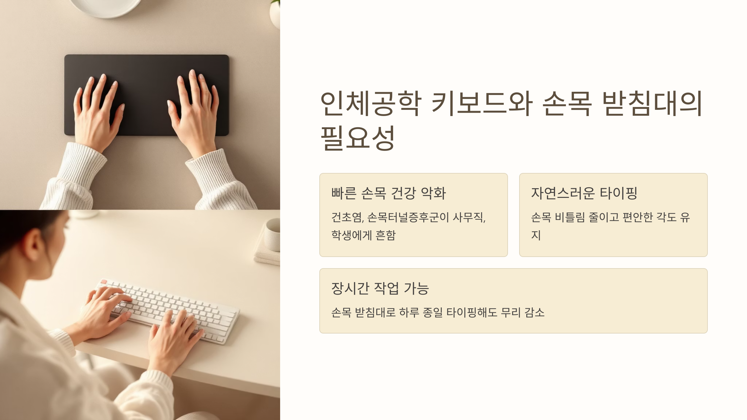 손목 건강은 생각보다 빠르게 무너집니다. 건초염, 손목터널증후군 등은 사무직, 학생, 크리에이터에게 특히 흔한 질환이에요. 인체공학 키보드는 손목의 비틀림을 줄이고, 자연스러운 각도로 타이핑할 수 있도록 도와줍니다. 거기에 손목 받침대까지 더하면? 하루 종일 타이핑해도 무리가 덜해요. 저처럼 손목이 자주 저리셨던 분이라면, 꼭 한 번 써보시길 추천드려요