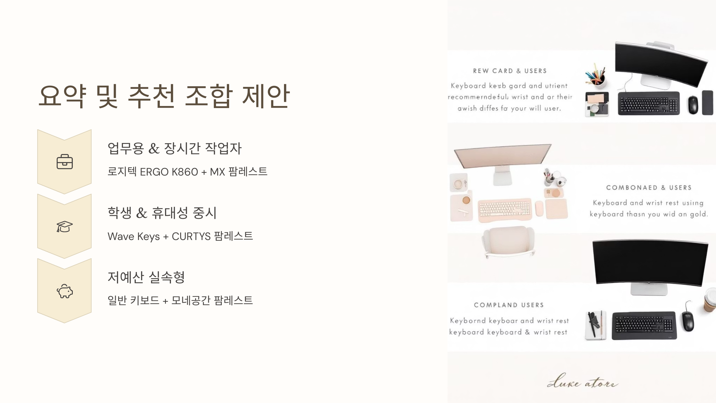 - 업무용 & 장시간 작업자 → 로지텍 ERGO K860 + MX 팜레스트