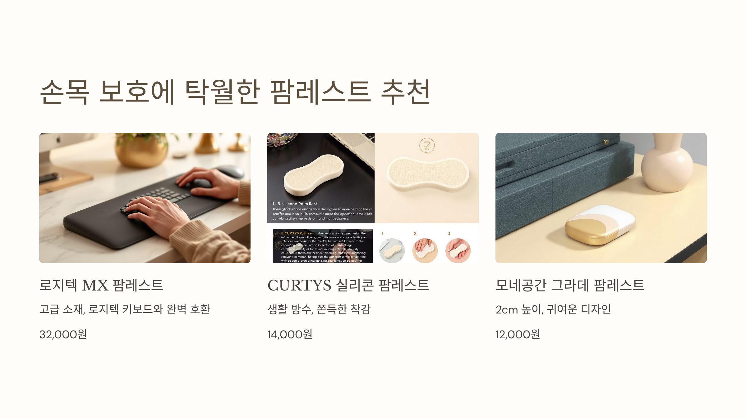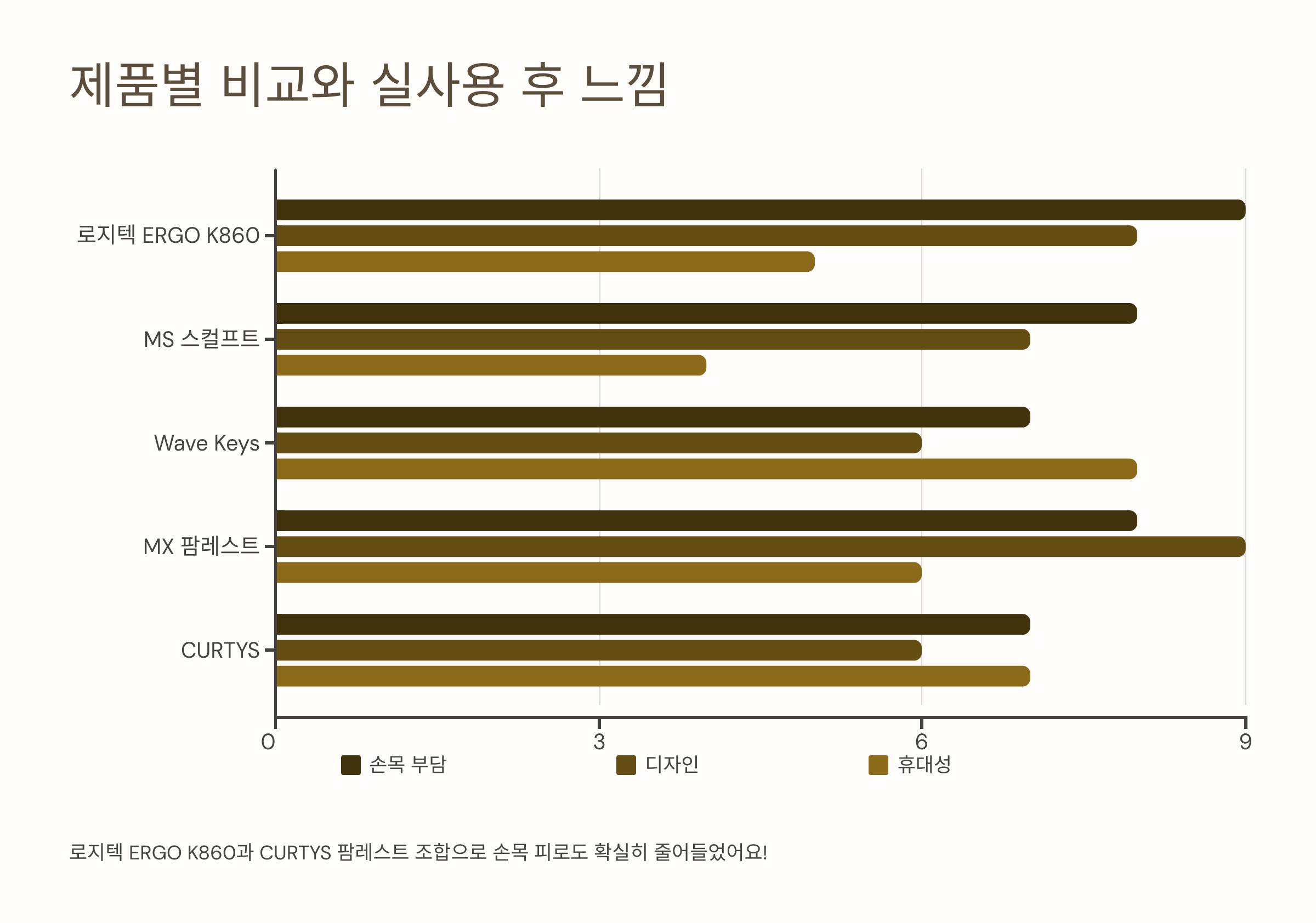 저는 로지텍 ERGO K860과 CURTYS 팜레스트 조합으로 쓰는데요, 확실히 손목 피로도가 줄어들고 타이핑 실수도 덜해졌어요!