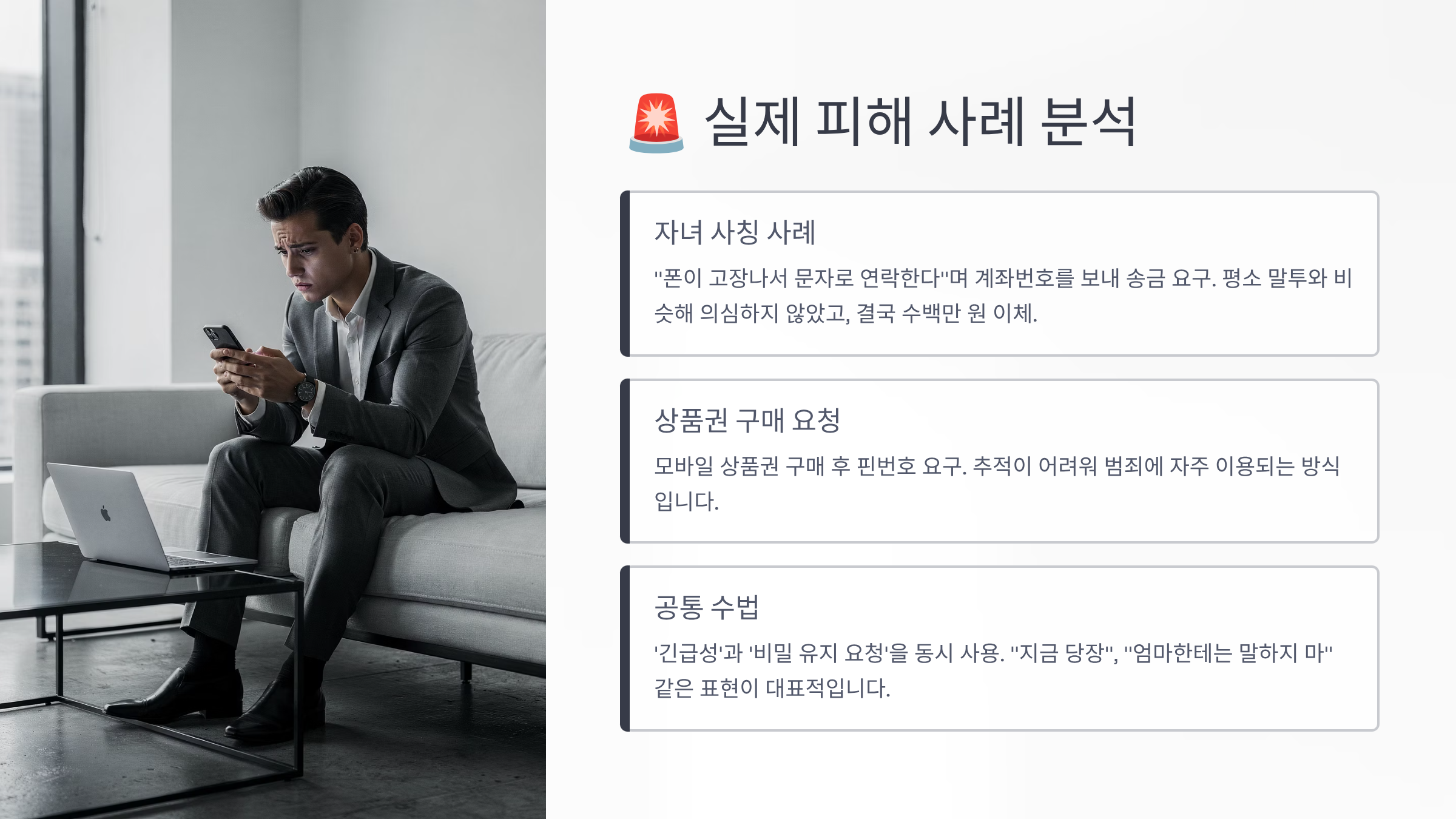 금융감독원 보이스피싱 피해 예방 자료에 따르면, 지인 사칭형은 ‘긴급성’과 ‘비밀 유지 요청’을 동시에 사용한다는 공통점이 있습니다. “지금 당장”, “엄마한테는 말하지 마” 같은 표현이 대표적입니다.