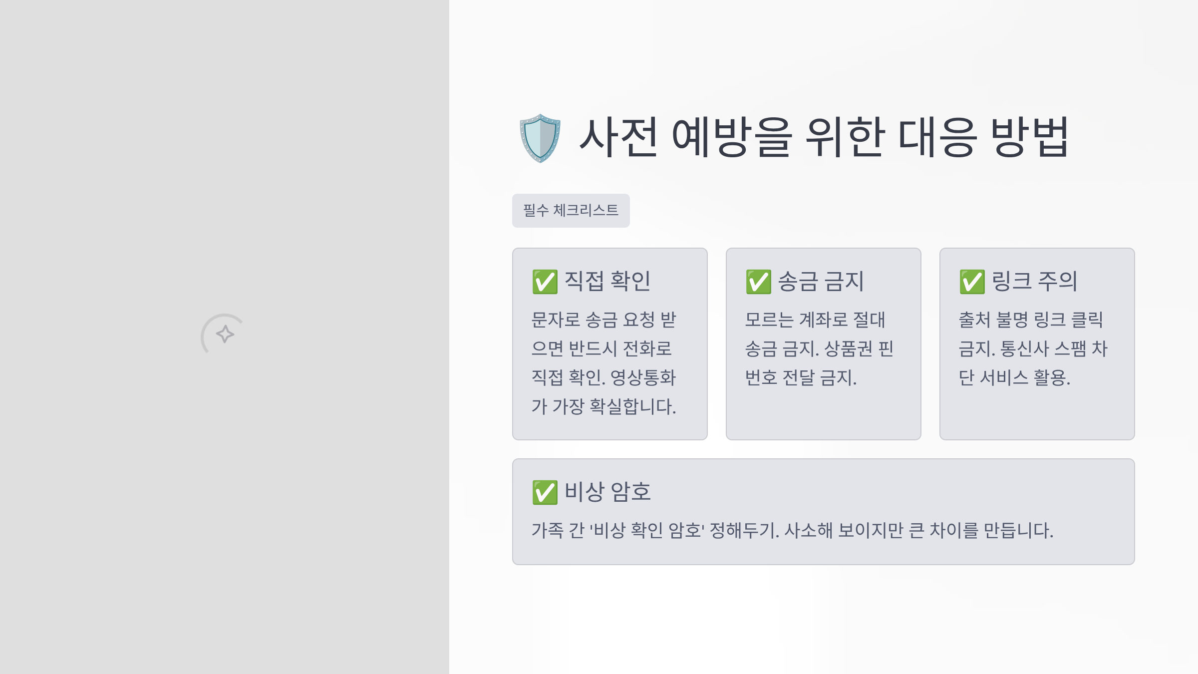 예방의 핵심은 ‘확인’입니다. 문자로 송금 요청을 받으면 반드시 전화로 직접 확인하세요. 영상통화가 가장 확실합니다.