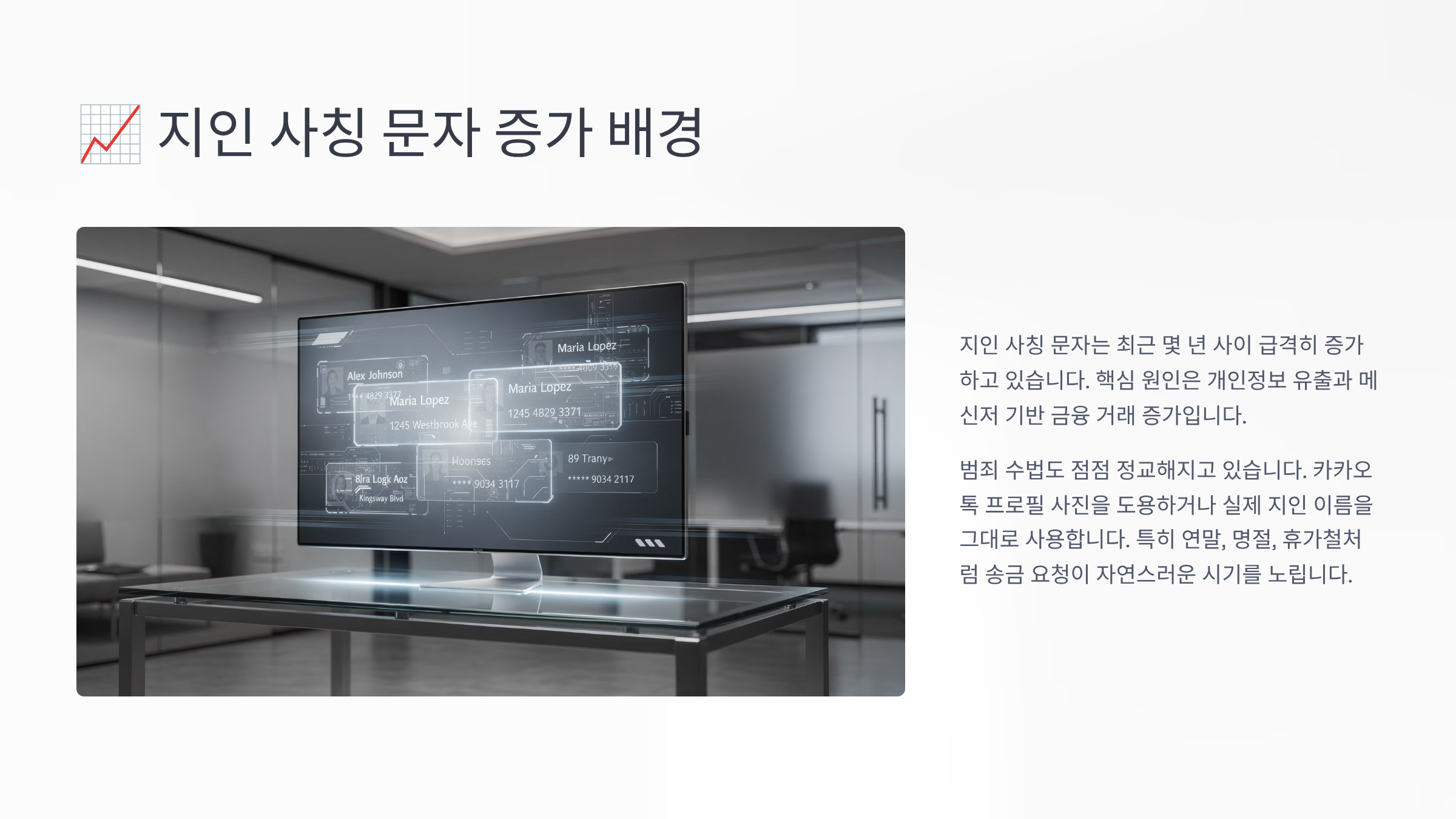 특히 연말, 명절, 휴가철처럼 송금 요청이 자연스러운 시기를 노린다는 점도 특징입니다. 시기적 특성과 심리적 허점을 동시에 공략하는 방식입니다.