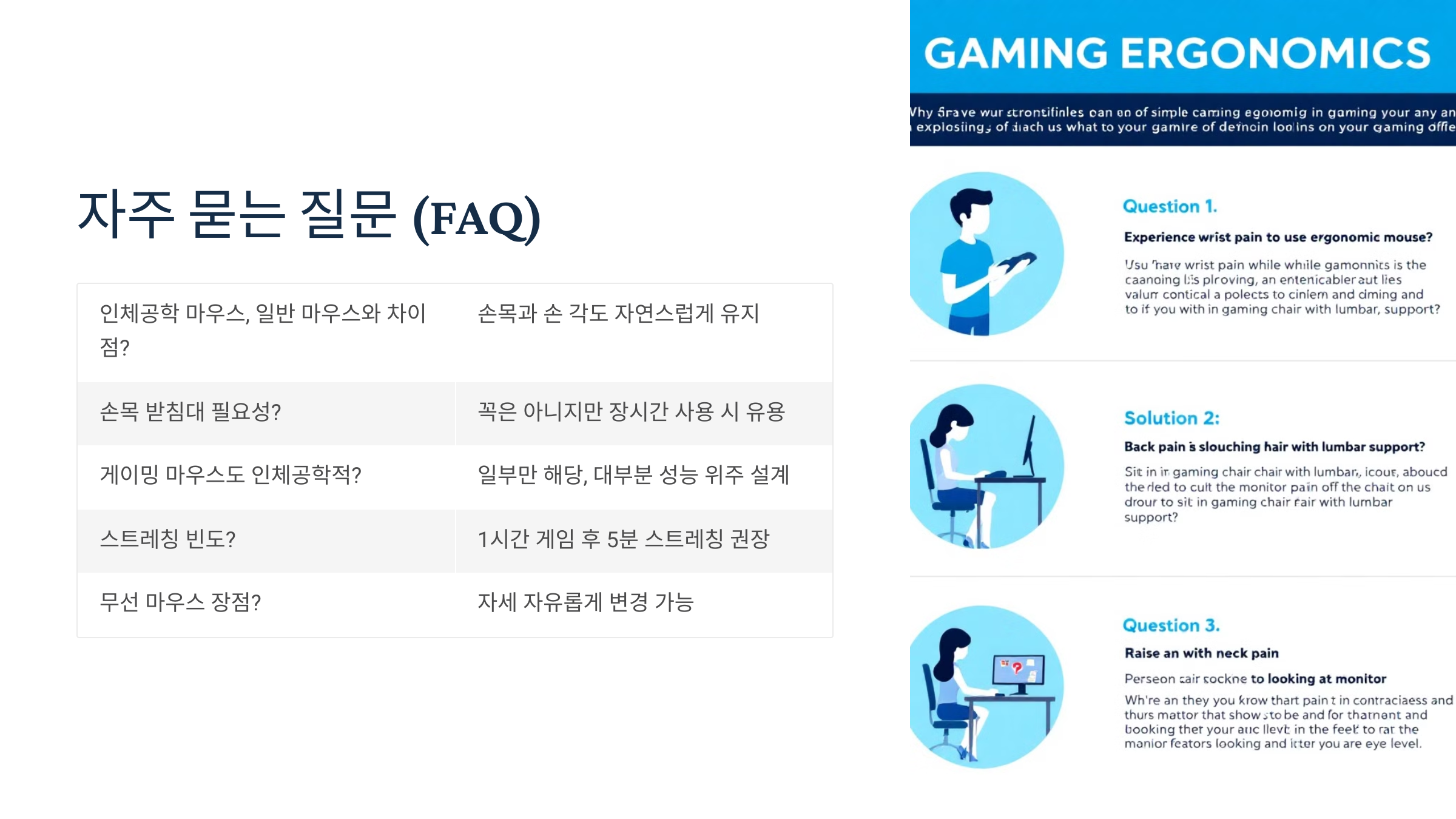🧑⚕️ 전문가들은 인체공학 장비의 중요성을 꾸준히 강조합니다. 예방이 최고의 치료라는 말처럼, 손목 통증이 심해지기 전에 미리 장비를 점검하고 바꾸는 것이 현명한 선택입니다. 특히 게이머처럼 반복 동작이 많은 사용자일수록 더욱 그렇습니다