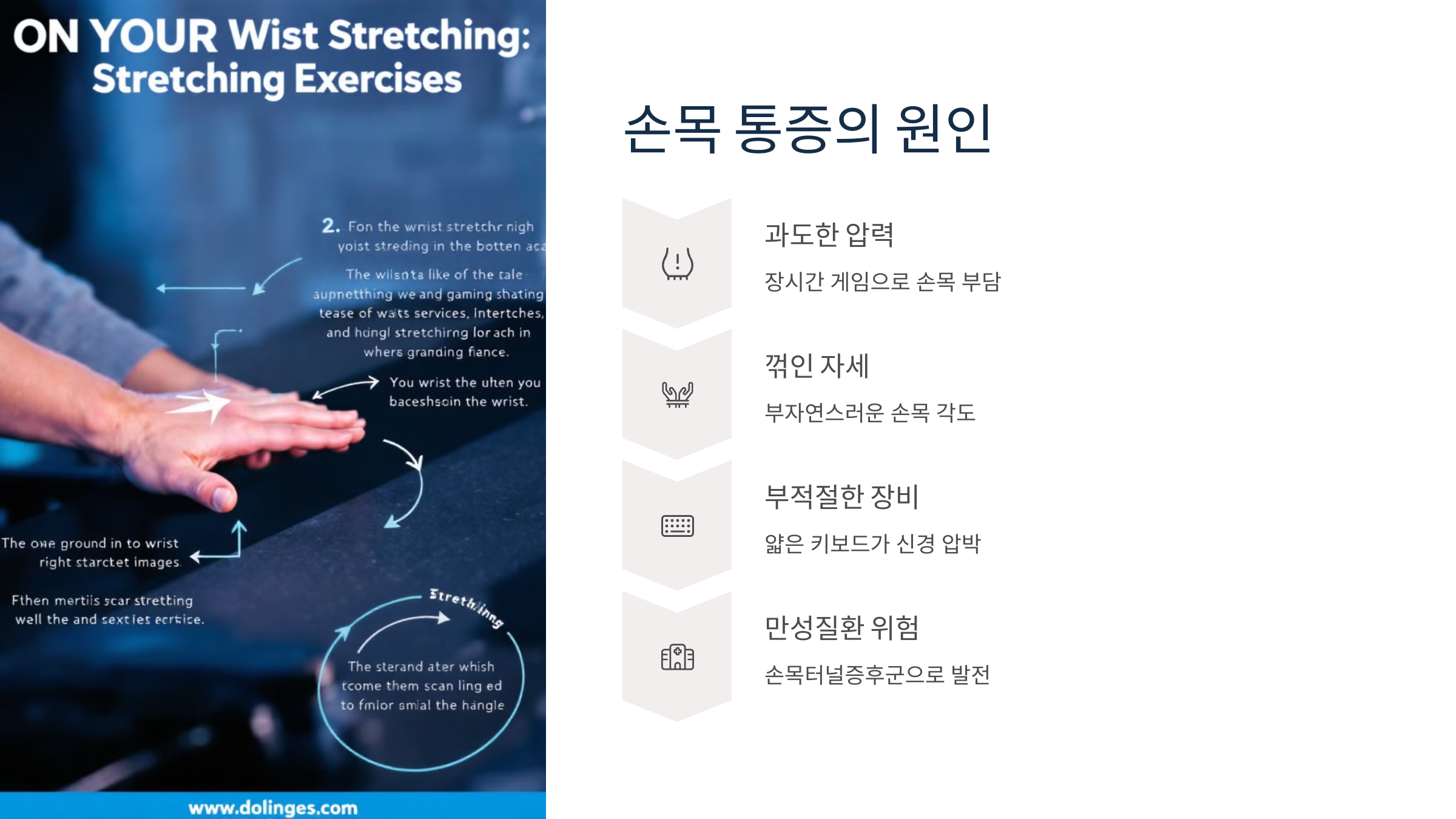 📉 게임을 오래하면 손목에 과도한 압력이 가해집니다. 특히 손목이 꺾인 상태로 장시간 마우스를 조작하거나, 얇은 키보드를 사용할 경우 신경이 눌리며 통증이나 저림 현상이 생깁니다. 이 증상은 단순한 불편을 넘어 ‘손목터널증후군’ 같은 만성질환이나 저림이나 감각이 둔해 질 수도 있고 목디스크같은 큰병으로 발전할 수도 있어요.