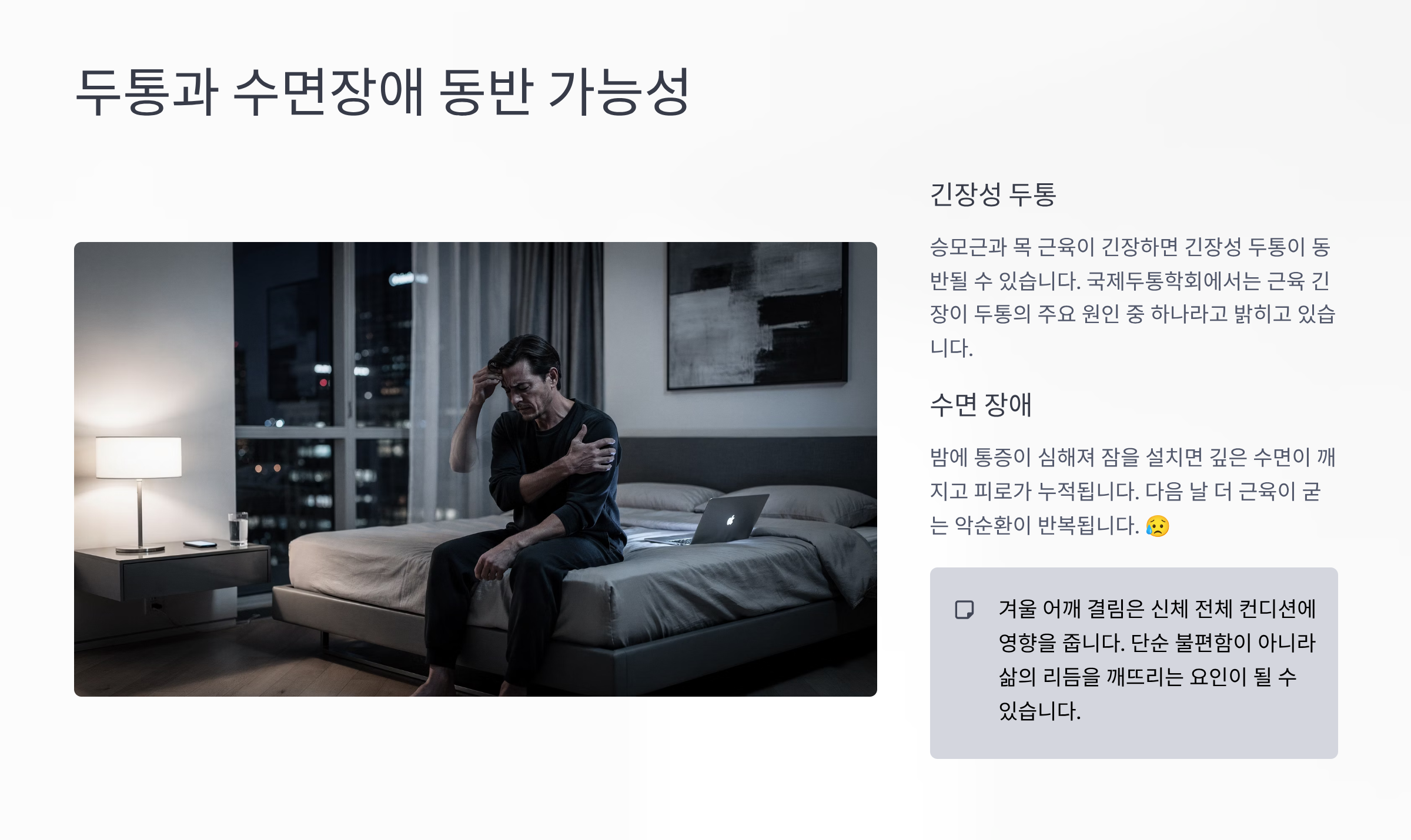 저는 특히 밤에 통증이 심해져 잠을 설친 경험이 있습니다. 깊은 수면이 깨지면 피로가 누적되고, 다음 날 더 근육이 굳는 악순환이 반복됩니다. 😥