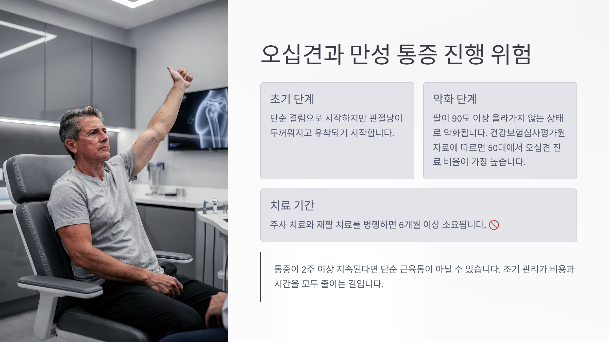 처음엔 단순 결림이지만, 관절낭이 두꺼워지고 유착되면 팔이 90도 이상 올라가지 않는 상태로 악화됩니다. 저희 지인도 “곧 괜찮아지겠지” 하고 몇 달을 버티다 결국 주사 치료와 재활 치료를 병행했습니다. 치료 기간만 6개월이 걸렸다고 합니다.