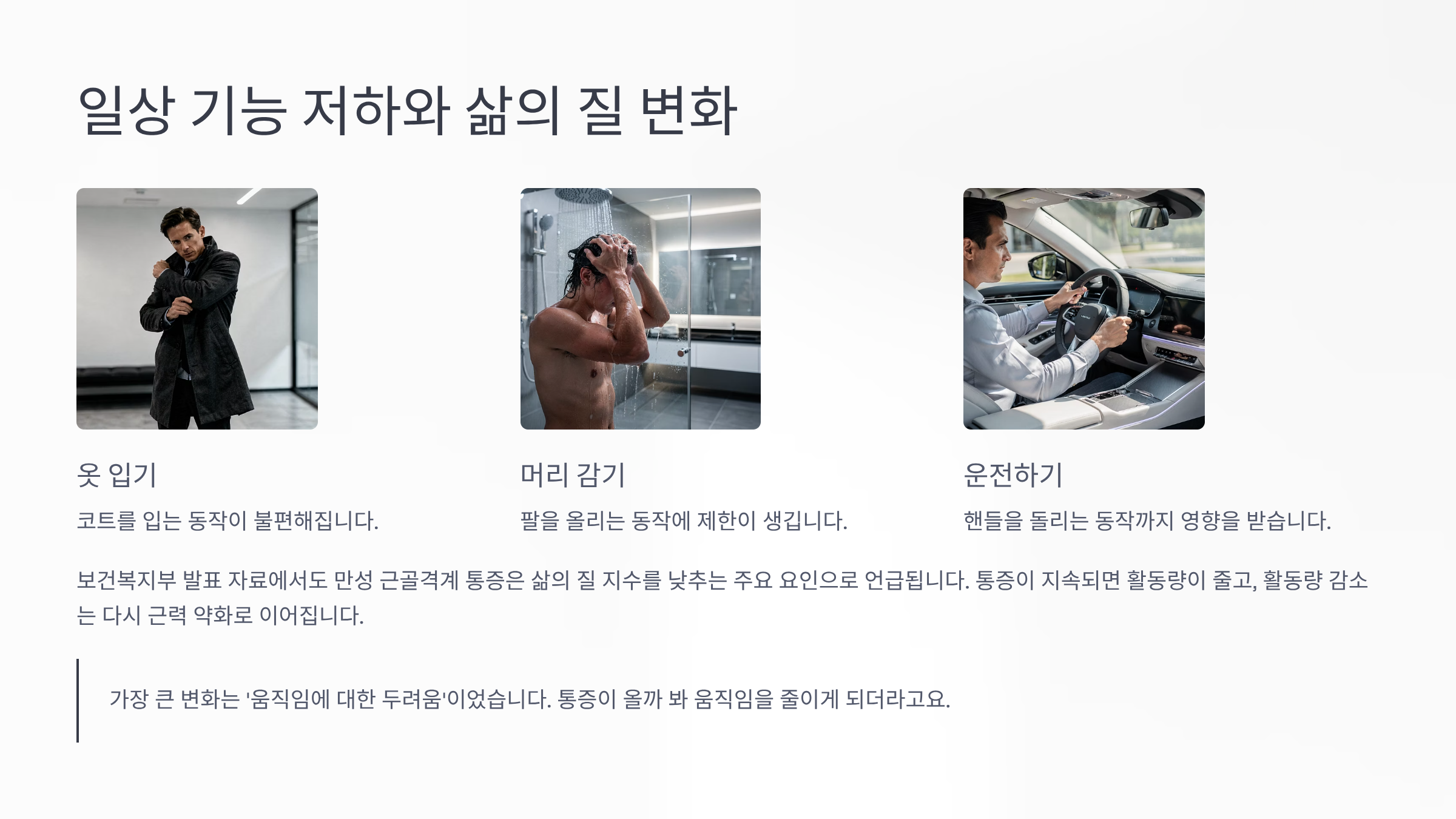 팔을 자유롭게 쓰지 못하면 생각보다 많은 일이 불편해집니다. 코트를 입는 동작, 머리를 감는 동작, 운전 중 핸들 돌리기까지 영향을 받습니다.