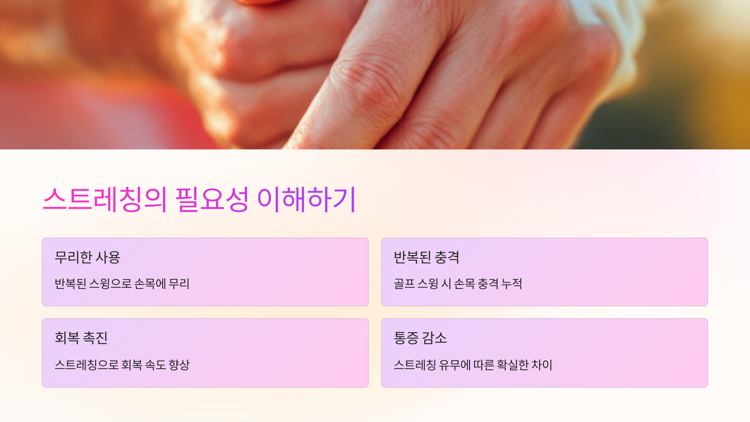 손목 통증은 대체로 '무리한 사용'과 '반복된 충격' 때문에 생기더라고요. 특히 골프처럼 스윙 동작이 반복되는 운동은 손목에 무리가 많이 가요. 그런 만큼, 운동 전후 스트레칭이 필수인데요! 손목 주변 근육과 인대를 풀어주면, 회복 속도도 빨라지고 통증도 확 줄어들어요. 실제로 스트레칭을 안 했던 날과 했던 날 차이가 크더라고요. 😲