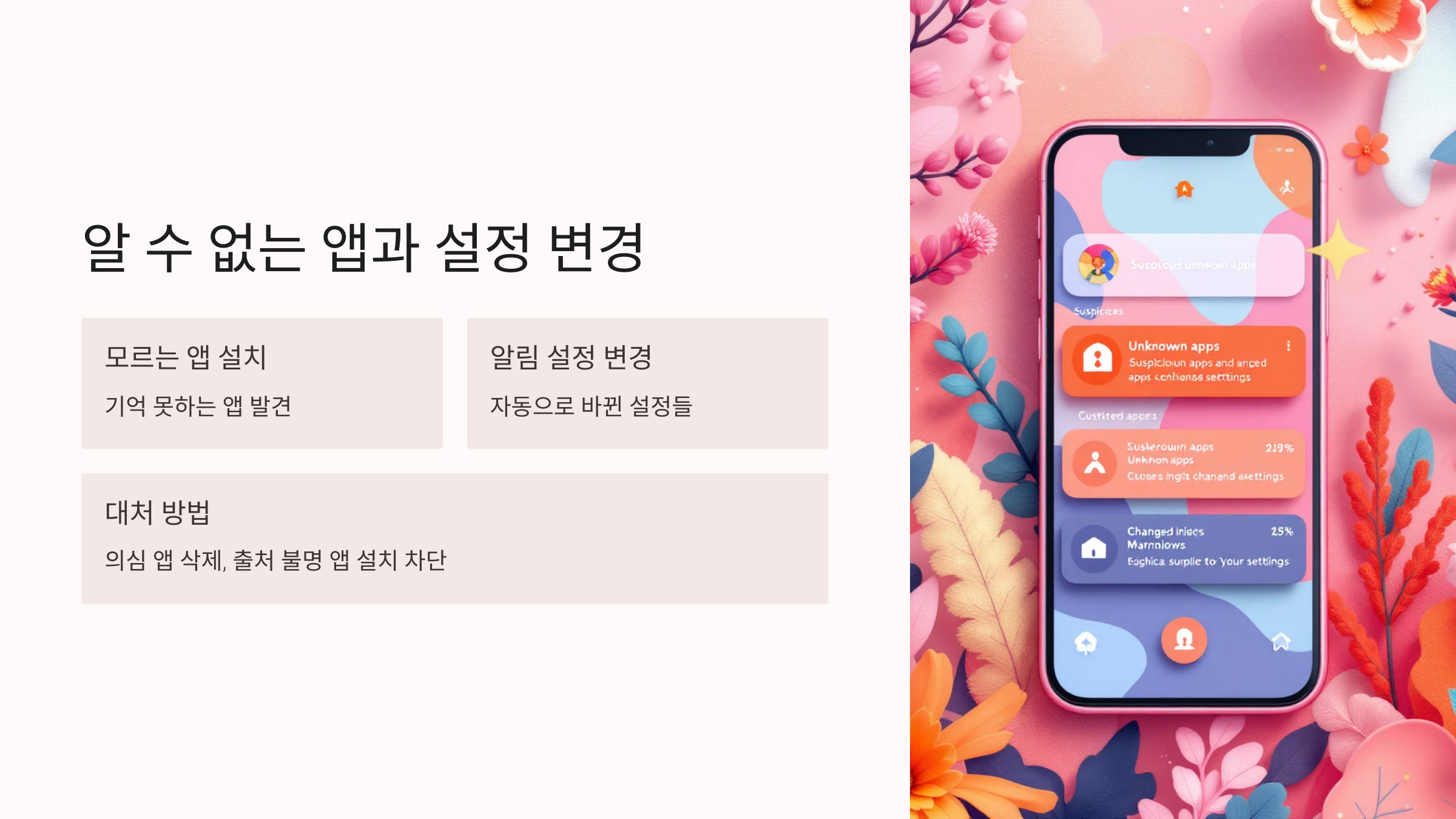 👾 '설정 > 앱 목록'에서 설치일자를 기준으로 의심스러운 앱을 삭제하세요.