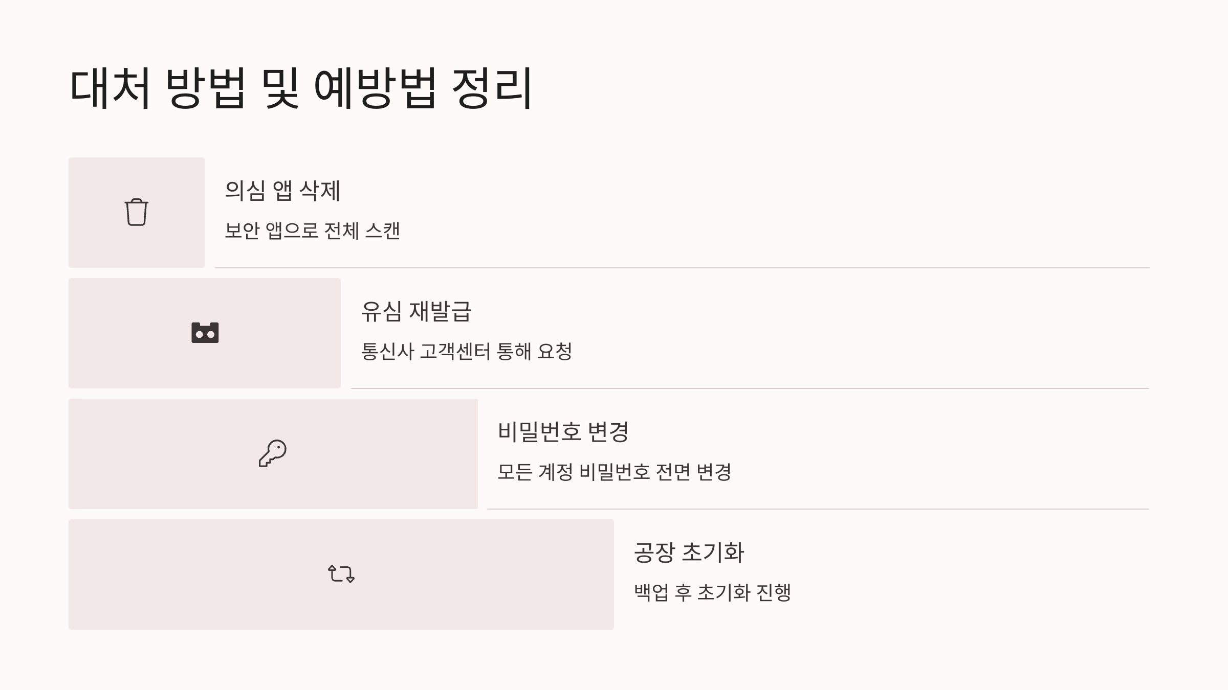 - 의심 앱 삭제 후 보안 앱으로 전체 스캔