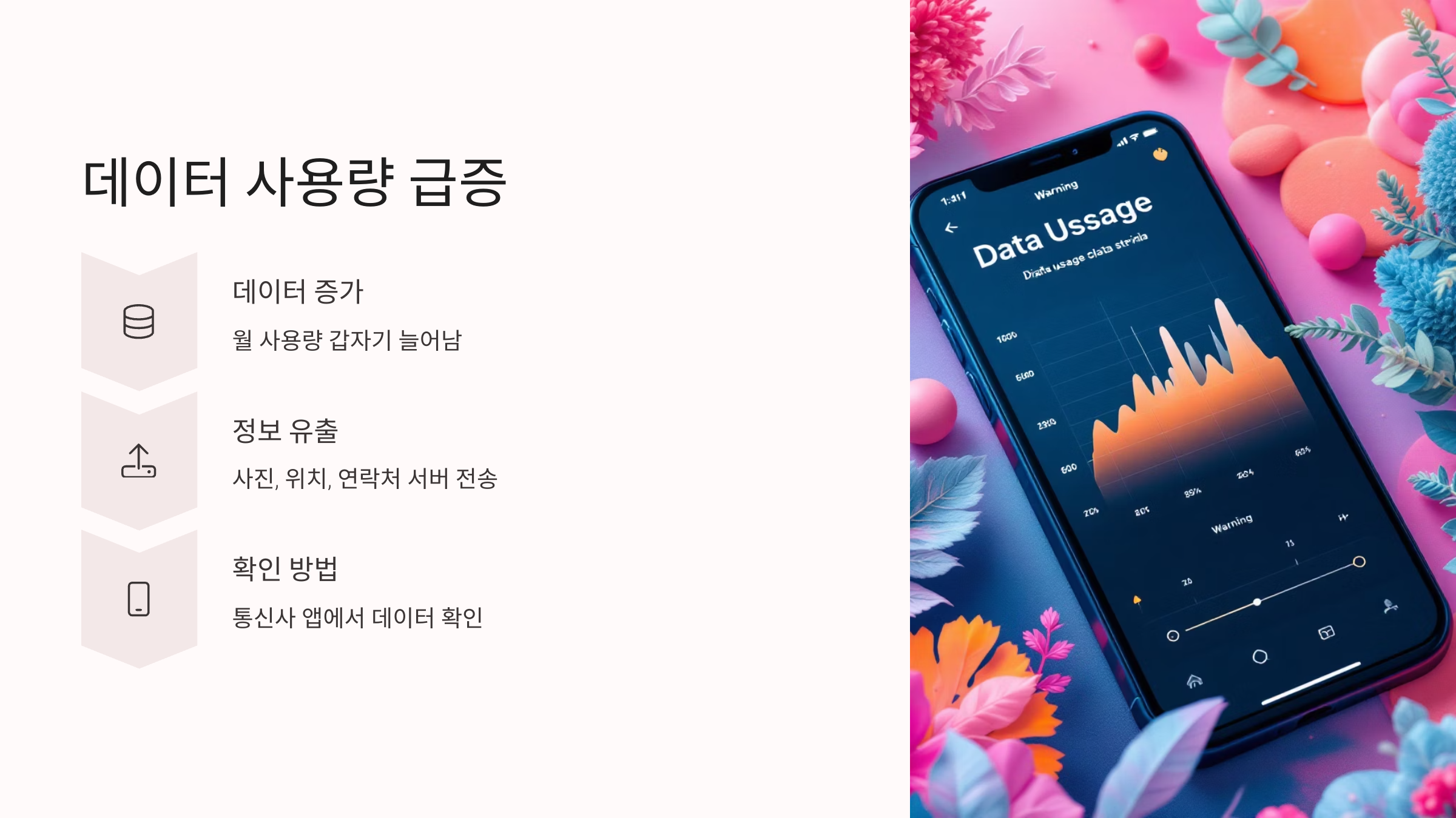특히 악성코드가 설치되면 사진, 위치 정보, 연락처 등을 서버로 전송하면서 데이터 소모가 심해질 수 있습니다.