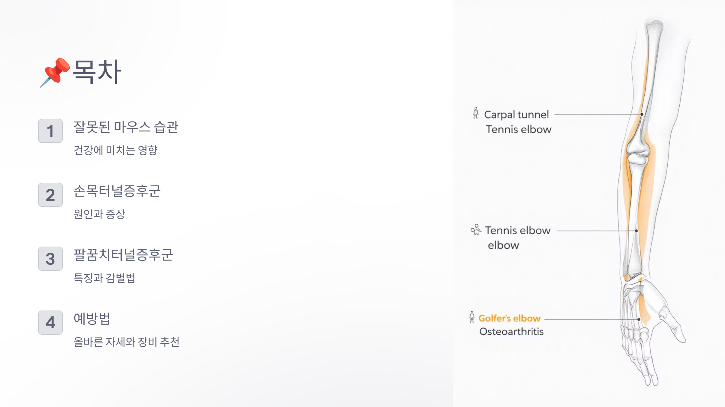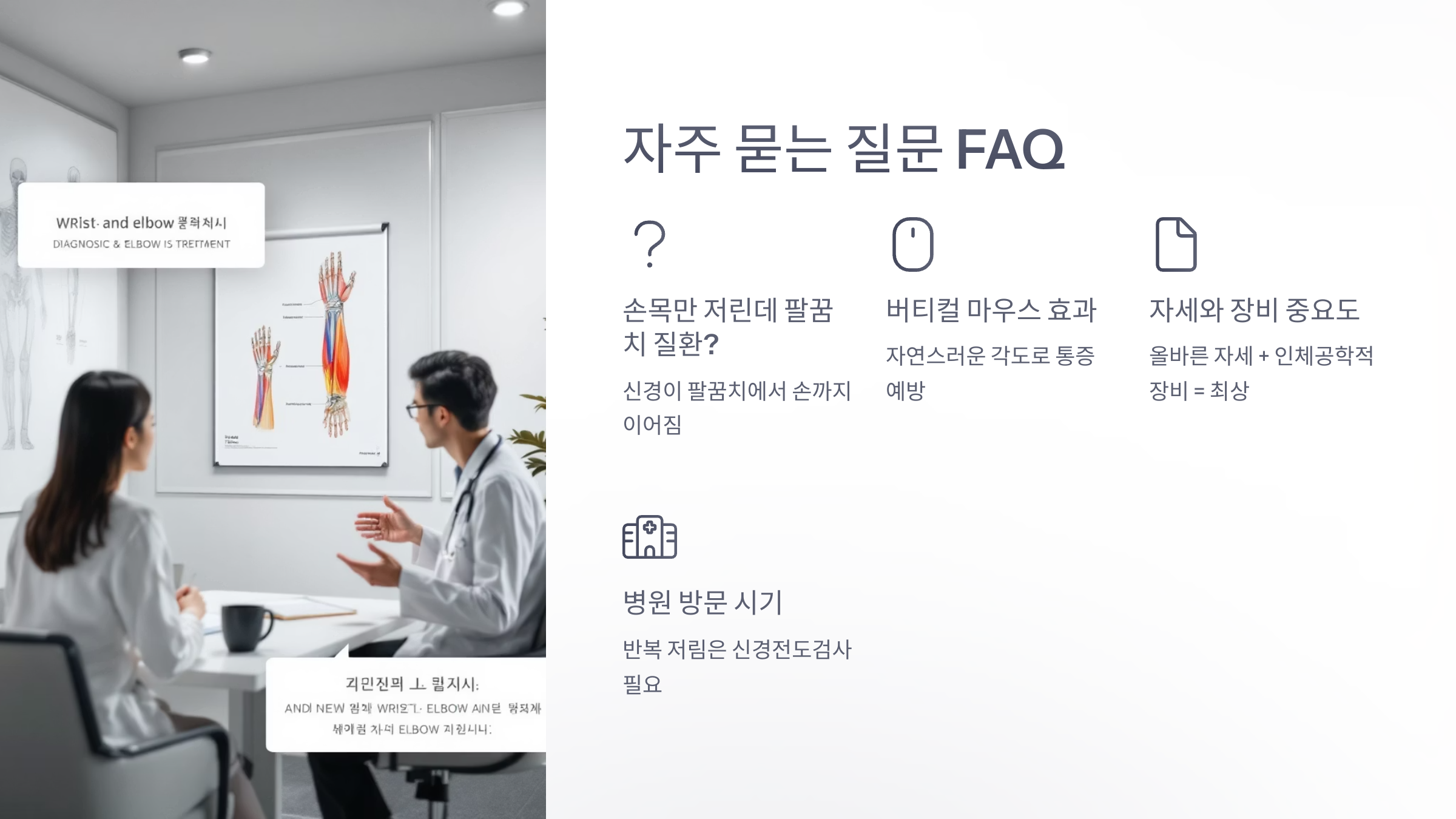하루에 몇 시간이나 마우스를 사용하시나요? 업무든 게임이든 컴퓨터 앞에 앉아 있는 시간이 길어질수록, 우리 몸은 조용히 SOS를 보내고 있습니다. 특히 잘못된 마우스 사용 습관은 손목과 팔꿈치에 심각한 질환을 유발할 수 있어요! 오늘은 그 질환들의 정체와 예방법에 대해 제대로 알아보겠습니다. 🖱️💥