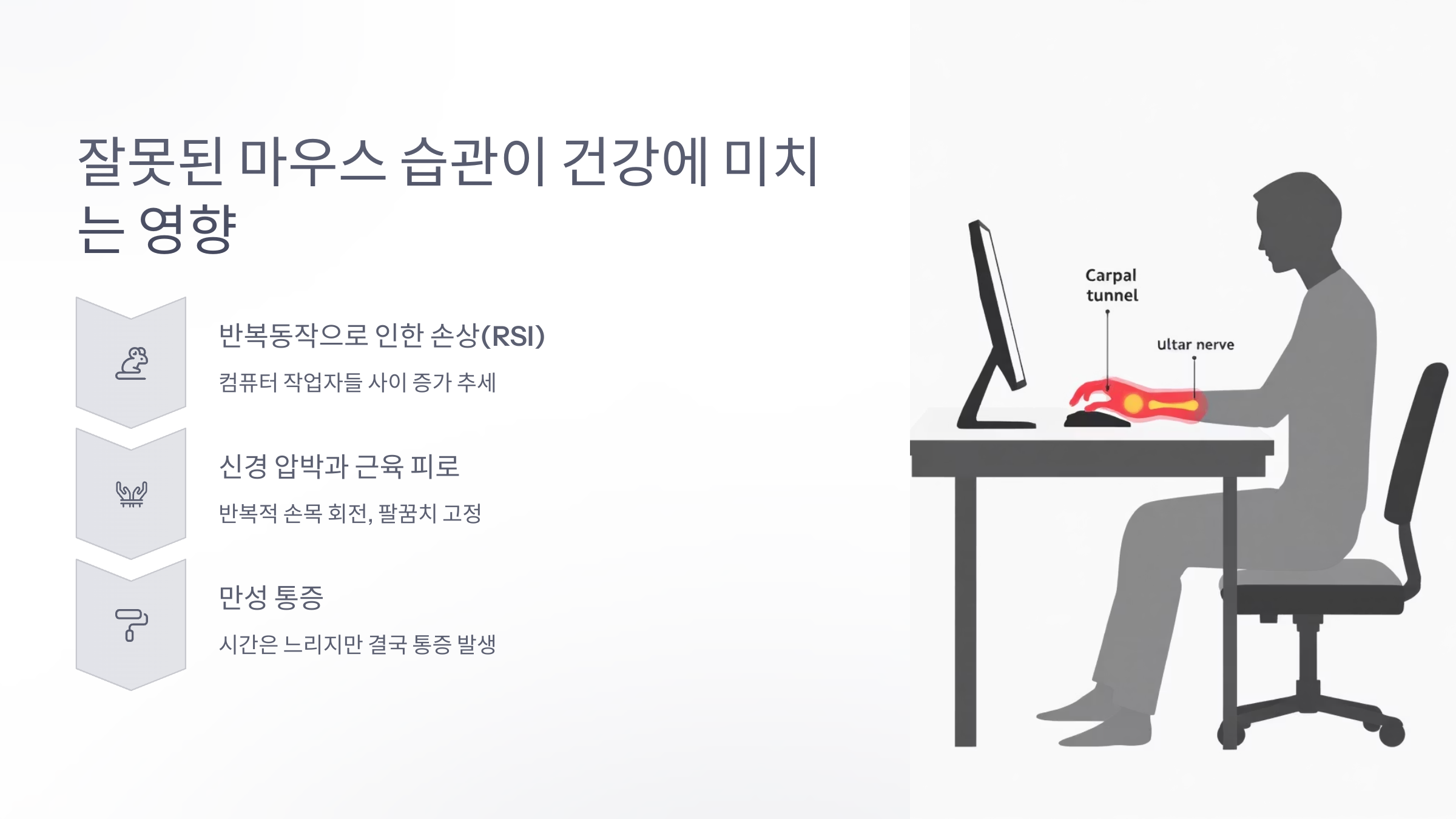 컴퓨터 작업을 오래 하는 사람들 사이에서 점점 늘어나는 것이 바로 반복동작으로 인한 손상(RSI)입니다. 반복적인 손목 회전, 팔꿈치 고정, 과도한 클릭 등은 신경 압박과 근육 피로를 유발해 만성 통증으로 이어지죠.