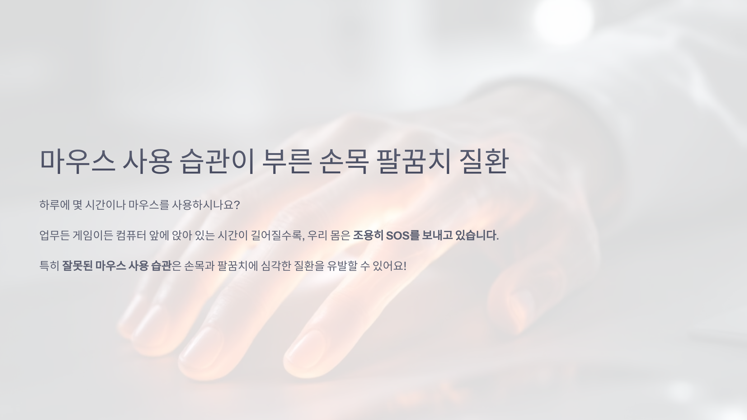 하루에 몇 시간이나 마우스를 사용하시나요? 업무든 게임이든 컴퓨터 앞에 앉아 있는 시간이 길어질수록, 우리 몸은 조용히 SOS를 보내고 있습니다. 특히 잘못된 마우스 사용 습관은 손목과 팔꿈치에 심각한 질환을 유발할 수 있어요! 오늘은 그 질환들의 정체와 예방법에 대해 제대로 알아보겠습니다. 🖱️💥