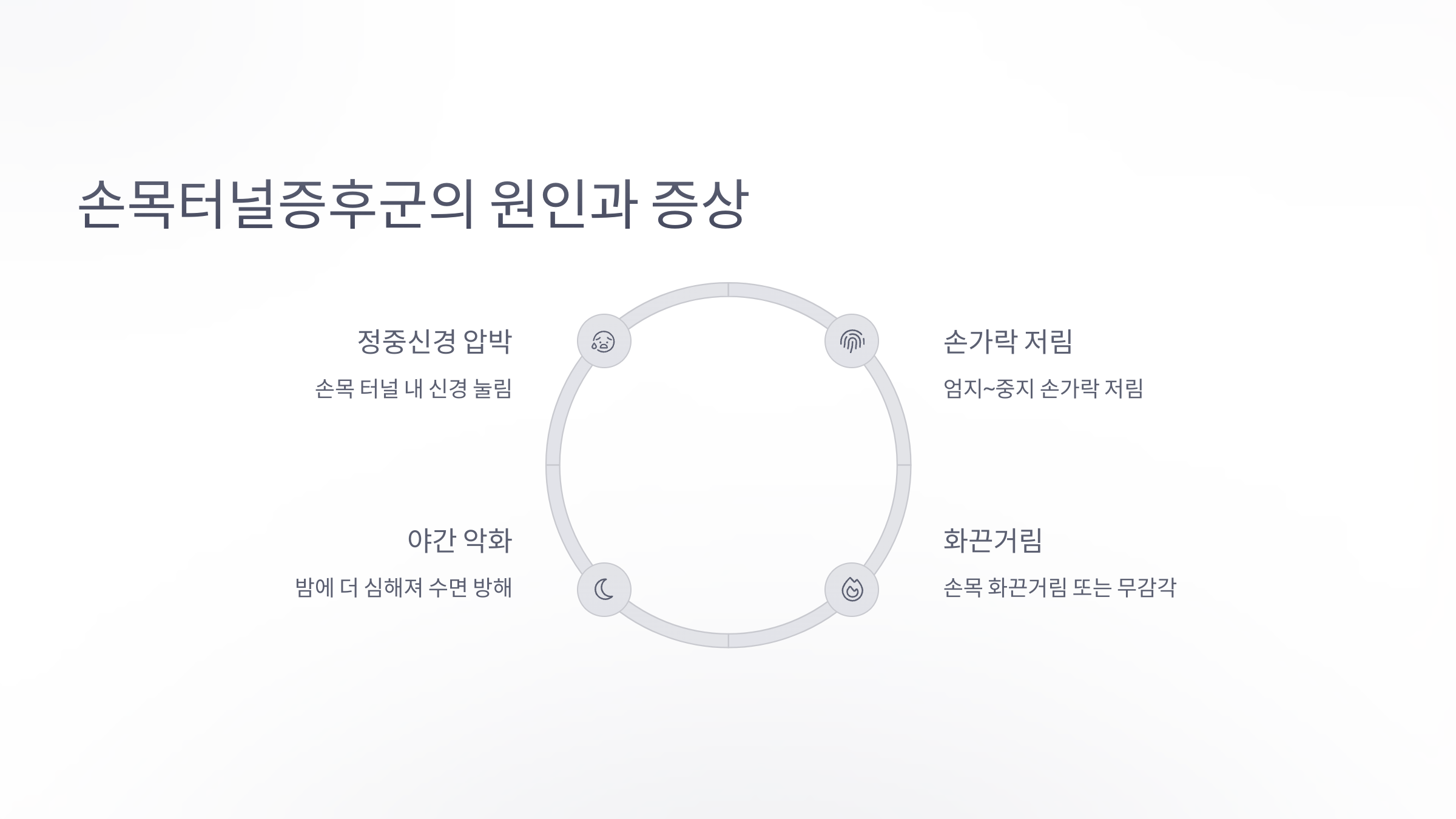 손목터널증후군은 손목을 지나가는 ‘정중신경’이 눌리면서 발생하는 질환이에요.