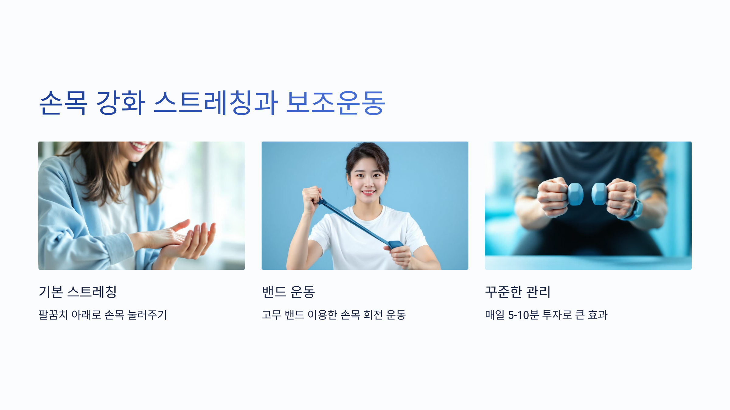 손목 자체를 강화하는 것도 정말 중요해요. 제가 추천하는 스트레칭은 팔꿈치 아래로 손목을 아래로 눌러주는 기본 손목 스트레칭, 그리고 고무 밴드를 이용한 손목 회전 운동이에요. 이런 운동은 매일 5~10분만 투자해도 차이가 크게 느껴져요! 손목도 결국 '근육'이니까 꾸준히 단련해줘야 부상도 예방할 수 있답니다 😊