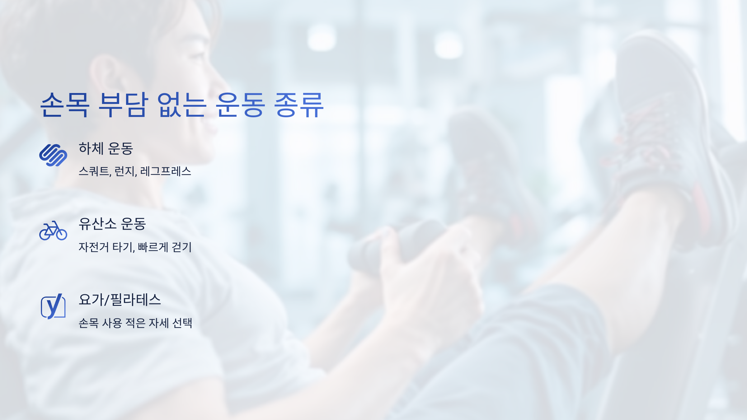손목에 부담을 주지 않는 운동은 생각보다 다양해요. 대표적으로는 하체 중심의 스쿼트, 런지 같은 운동이 있고, 유산소로는 자전거 타기 🚴♂️, 빠르게 걷기🚶♀️ 등이 있어요. 요가나 필라테스에서도 손목을 거의 사용하지 않는 자세들이 있으니, 루틴을 조정하면 충분히 운동 효과를 낼 수 있답니다. 저는 개인적으로 레그프레스와 힙 어브덕션을 자주 활용해요. 기구 없이도 집에서 할 수 있는 동작들도 많아요!