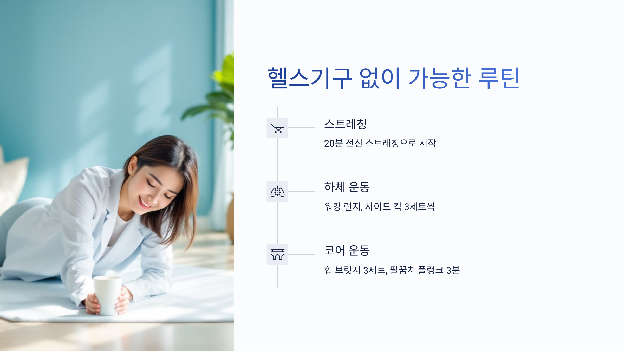 헬스장을 가지 않아도 괜찮아요! 집에서도 손목에 부담을 줄이지 않으면서 운동할 수 있어요. 요즘 제가 즐겨 하는 루틴은 20분 전신 스트레칭 + 하체 집중 루틴이에요. 예: 워킹 런지 3세트, 사이드 킥 3세트, 힙 브릿지 3세트, 코어 3분 플랭크(팔꿈치 플랭크로 변경!). 기구가 없어도 충분히 할 수 있고, 손목 통증도 없어서 좋아요. 무엇보다 꾸준히 할 수 있는 게 가장 큰 장점이에요!