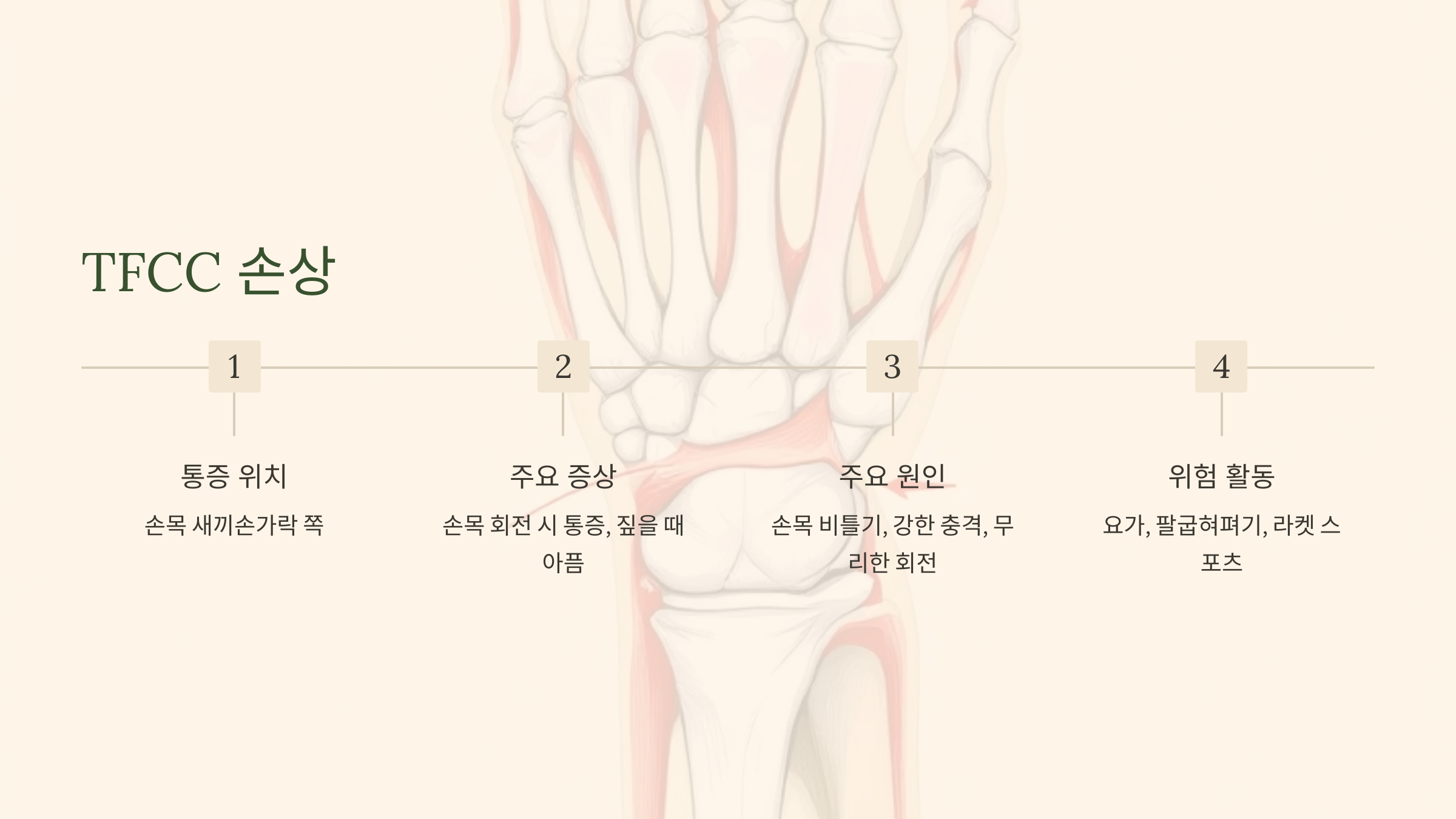 📍원인: 손목 비틀기, 강한 충격, 무리한 회전 동작