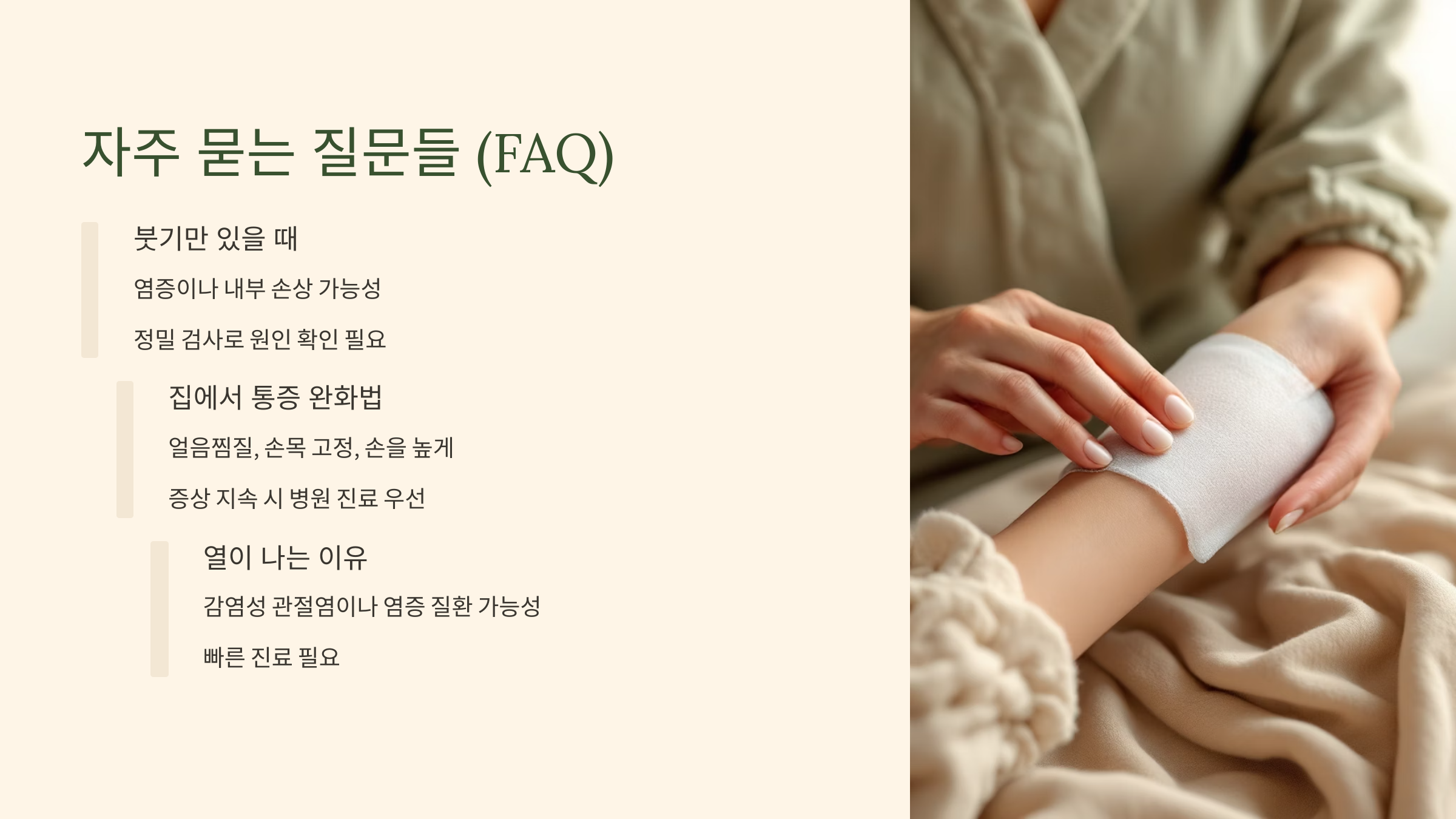 얼음찜질, 손목 고정, 손을 심장보다 높게 두는 것이 도움이 됩니다. 하지만 증상이 지속되면 병원 진료가 우선이에요.