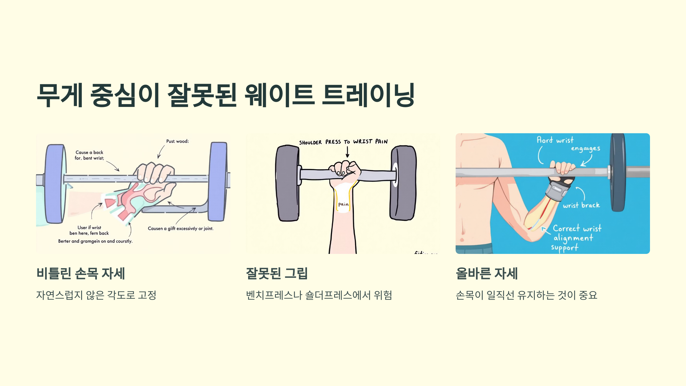 무게를 들 때 손목이 자연스러운 각도가 아닌 비틀린 상태로 고정되면, 관절과 신경에 큰 무리가 가요. 특히 벤치프레스나 숄더프레스 같은 상체 운동에서 그립을 잘못 잡으면 손목터널증후군이 심해질 수 있어요. 저도 초기에 무게만 늘리다가 손목이 말썽을 부렸죠. 😣