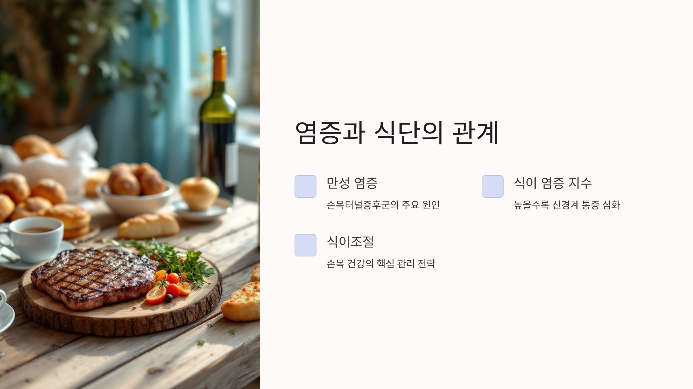 손목 건강을 위한 식단 전략은 염증 억제와 신경 회복이 핵심입니다.