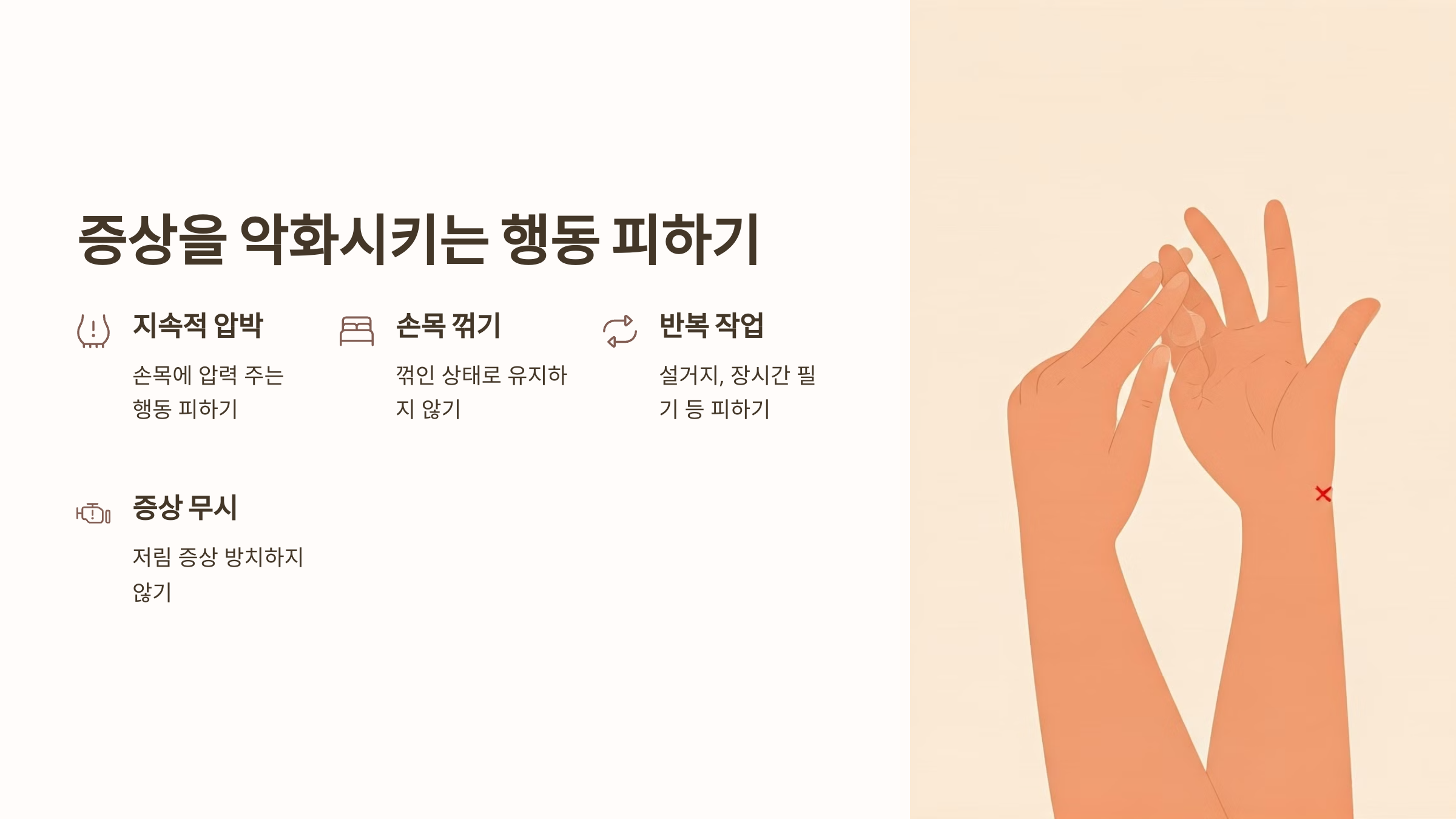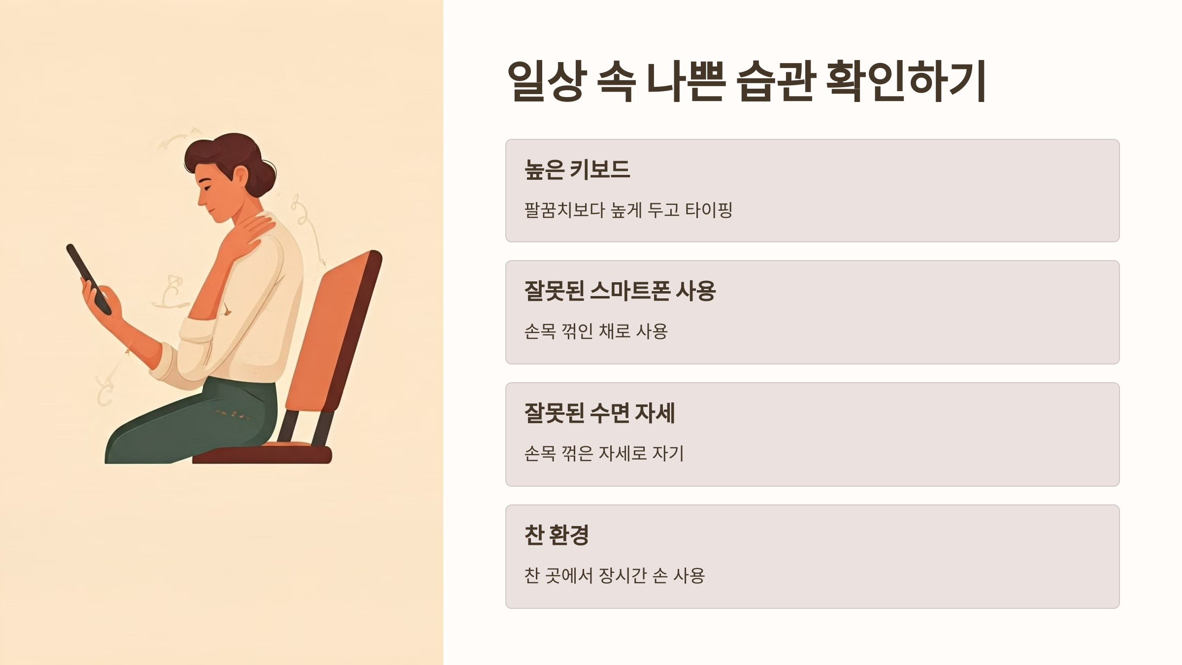이런 사소한 습관들이 모여 손목터널증후군의 직접적인 원인이 되기도 해요. 지금 당장 점검해보세요!