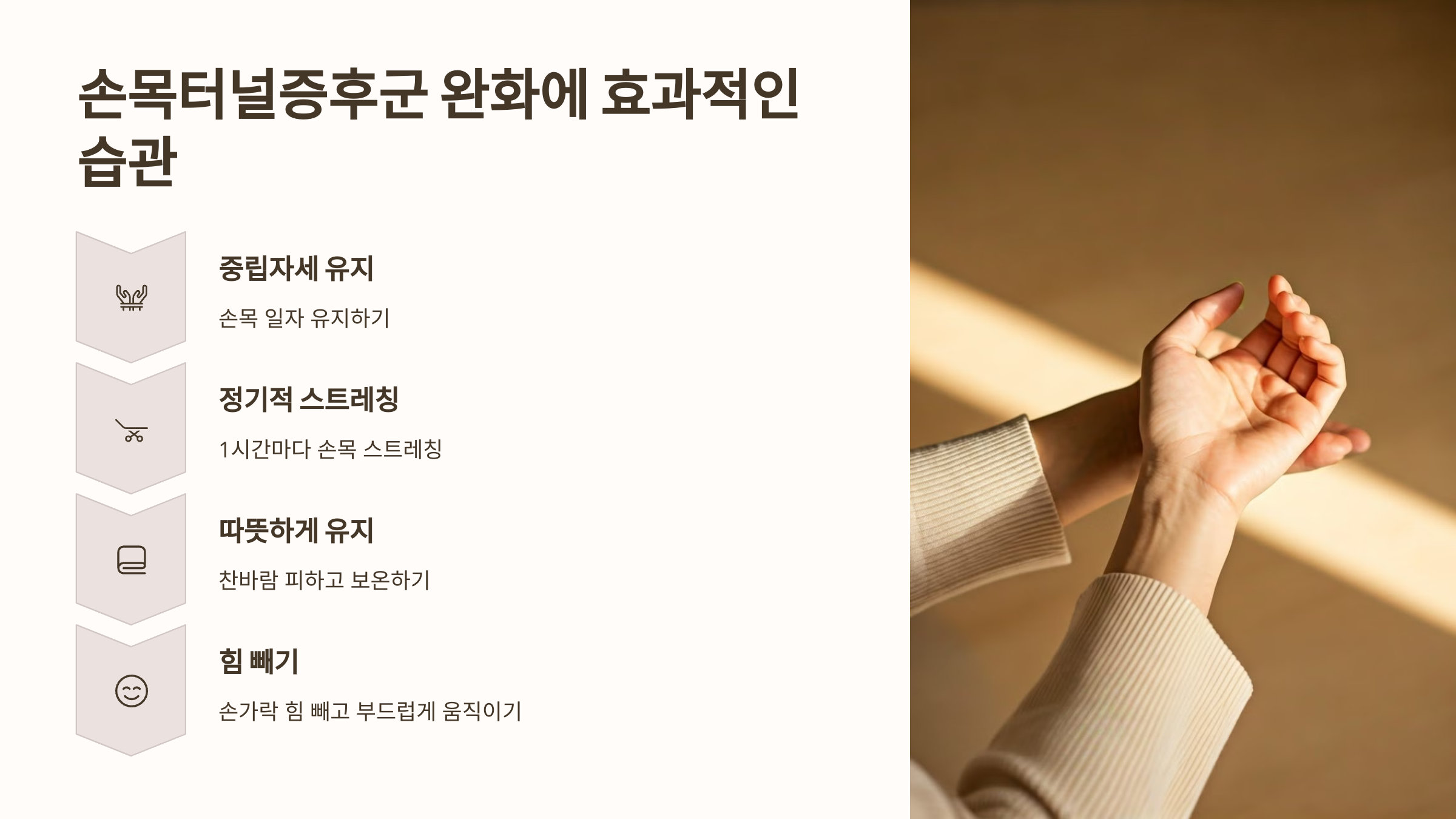 생활 속에서 할 수 있는 증상 완화 습관들을 정리해봤어요. 실천만 해도 손목이 훨씬 편안해집니다! 🙌