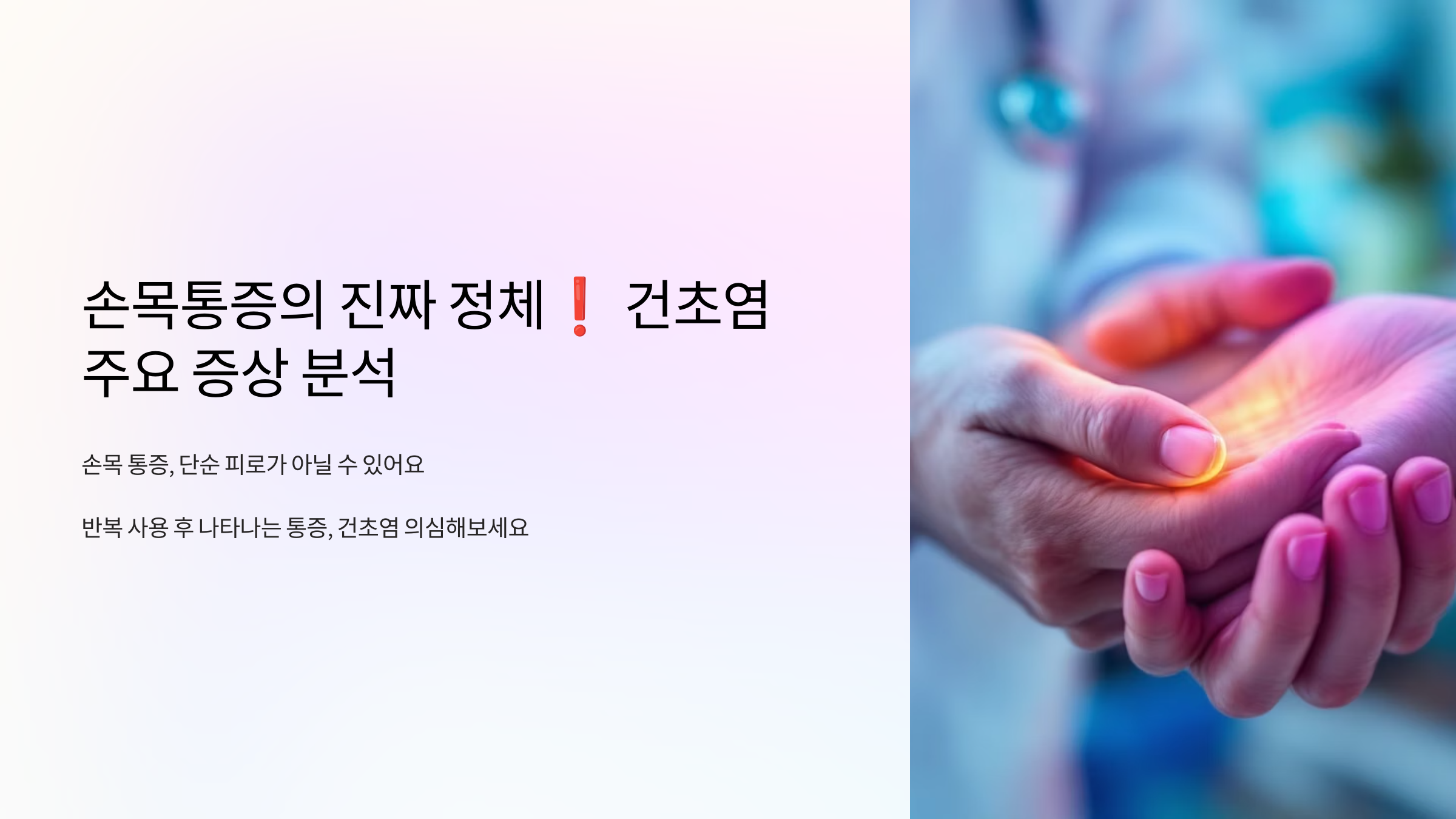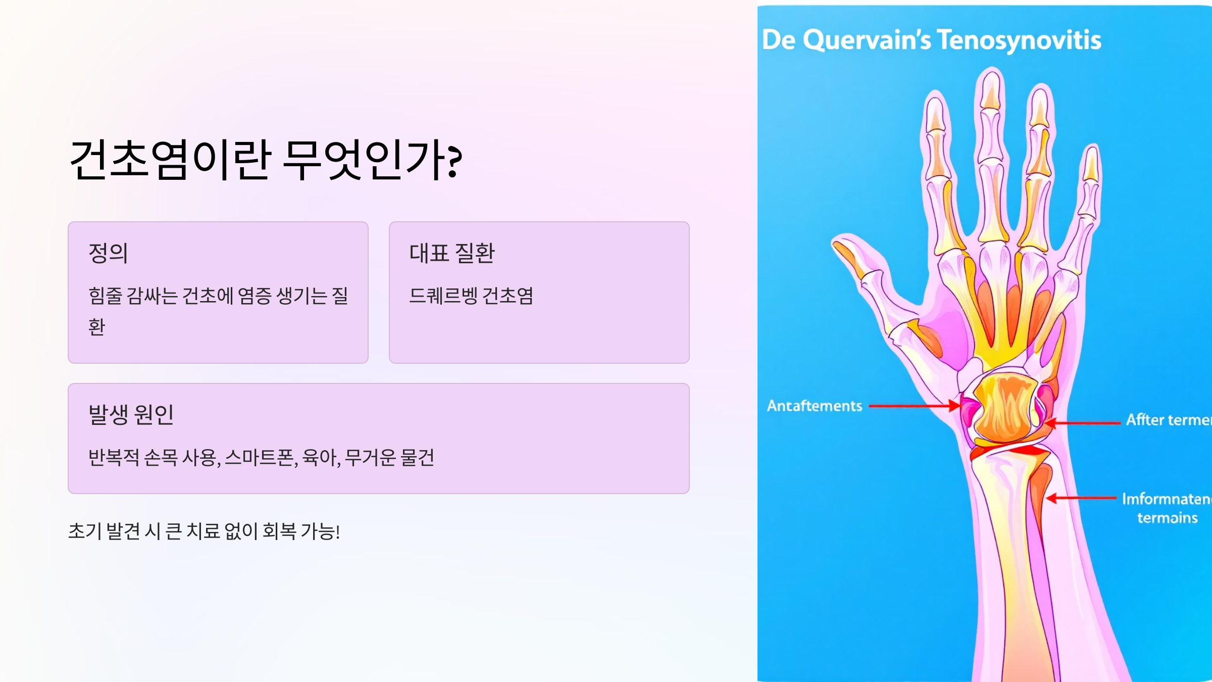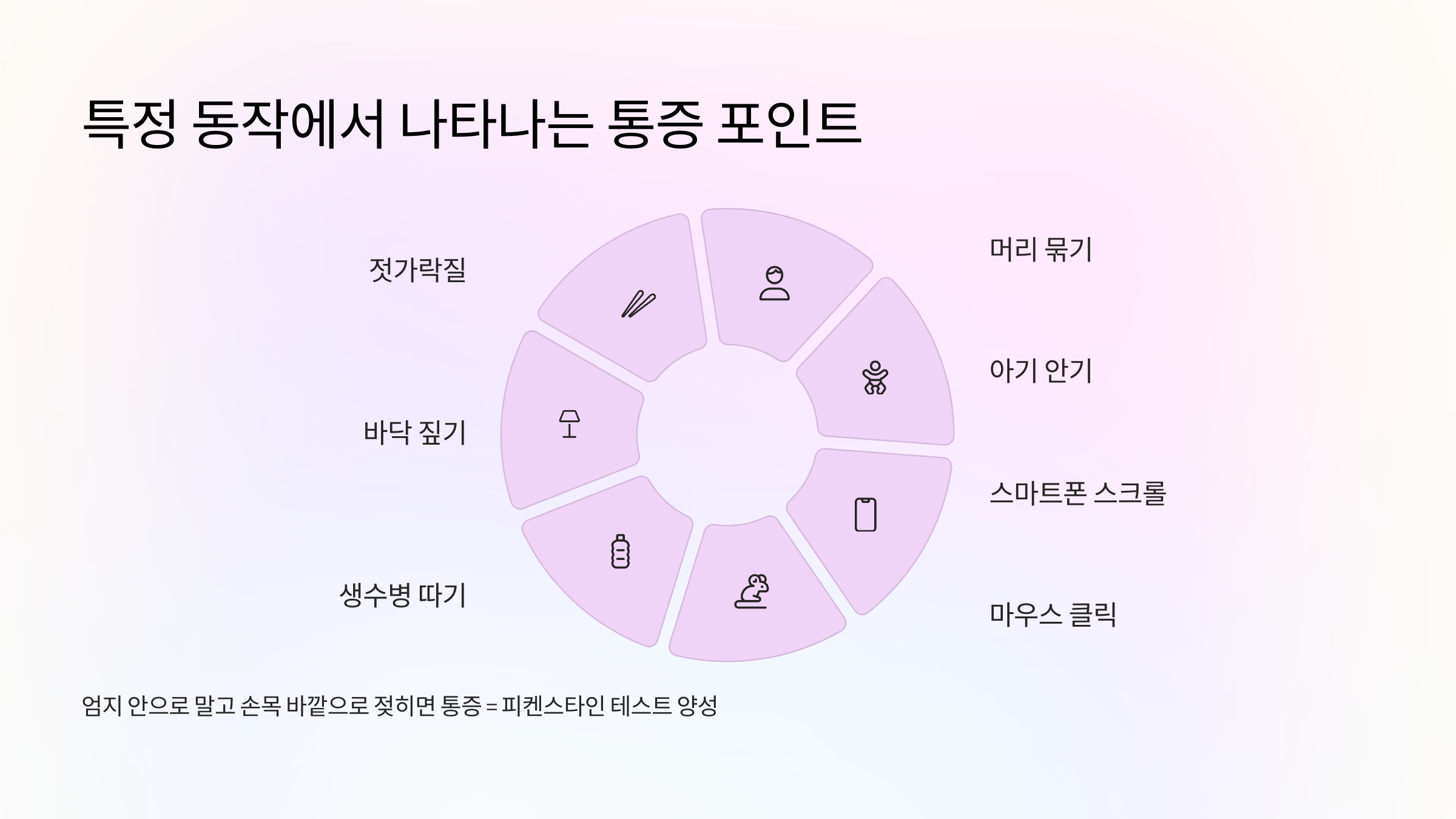 - 발생 원인: 반복적인 손목 사용, 스마트폰 과다, 육아(아기 안기), 무거운 물건 들기