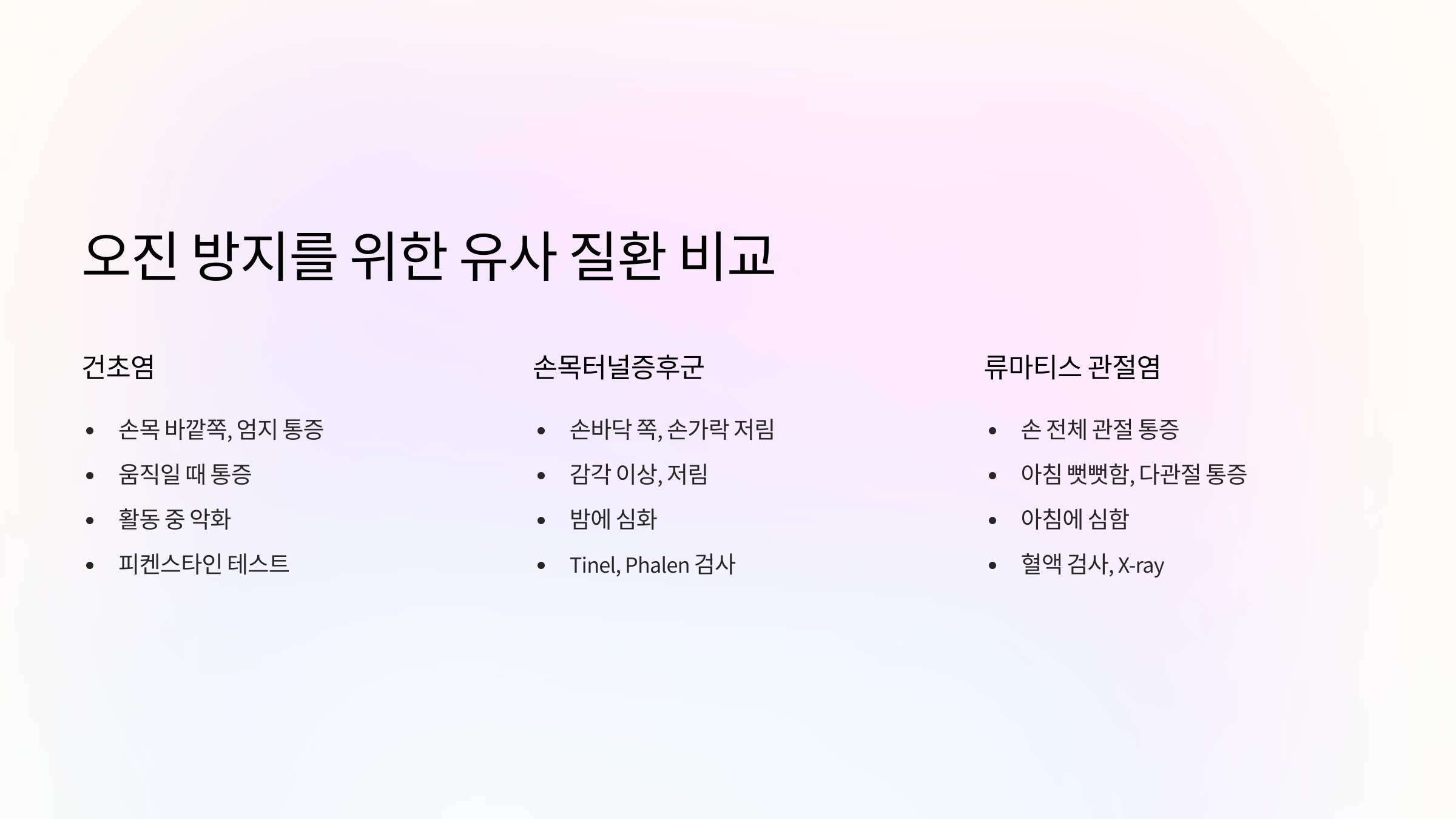 | 통증 위치 | 손목 바깥쪽, 엄지 | 손바닥 쪽, 손가락 저림 | 손 전체 관절 |