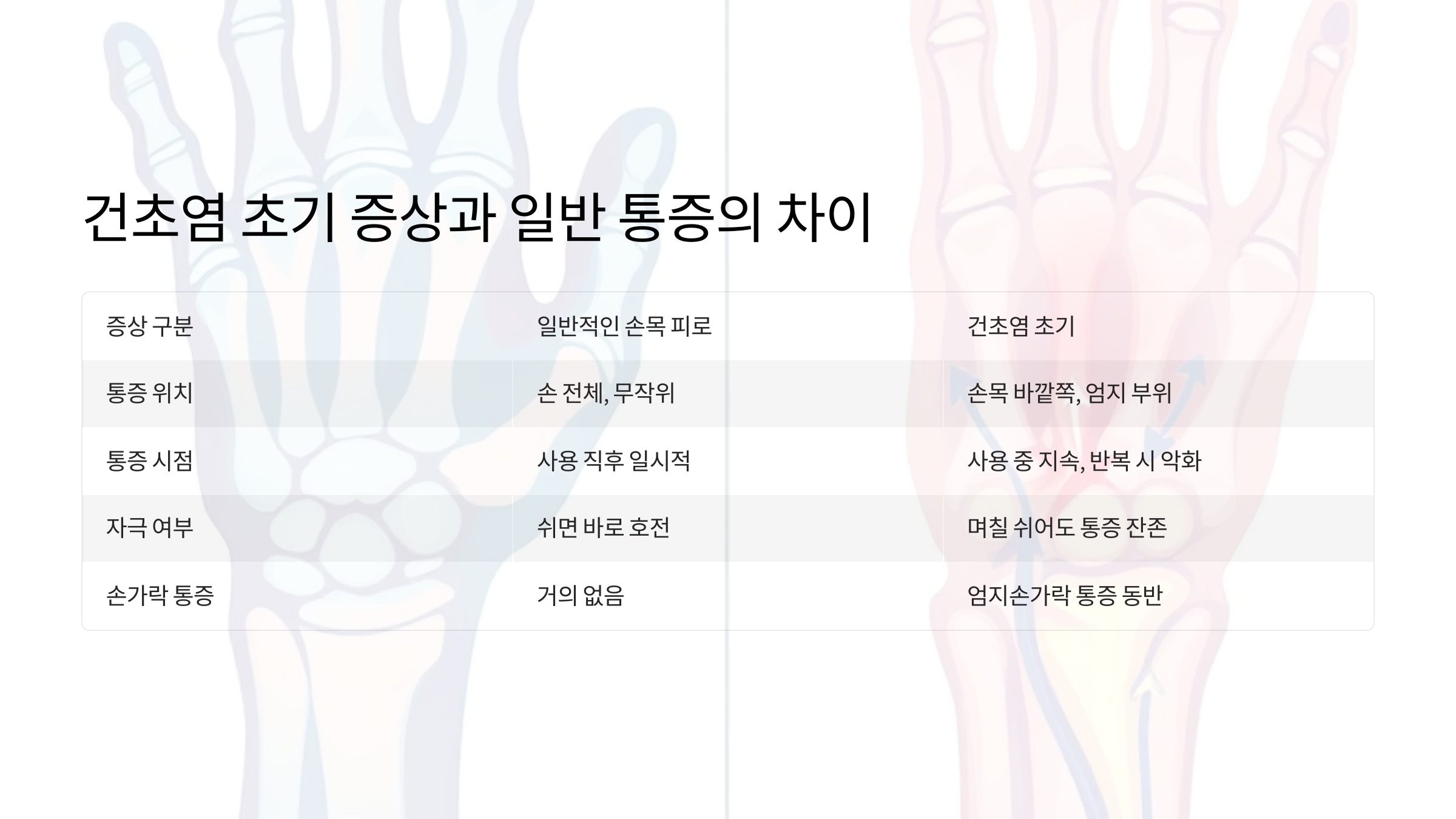 | 증상 구분 | 일반적인 손목 피로 | 건초염 초기 |