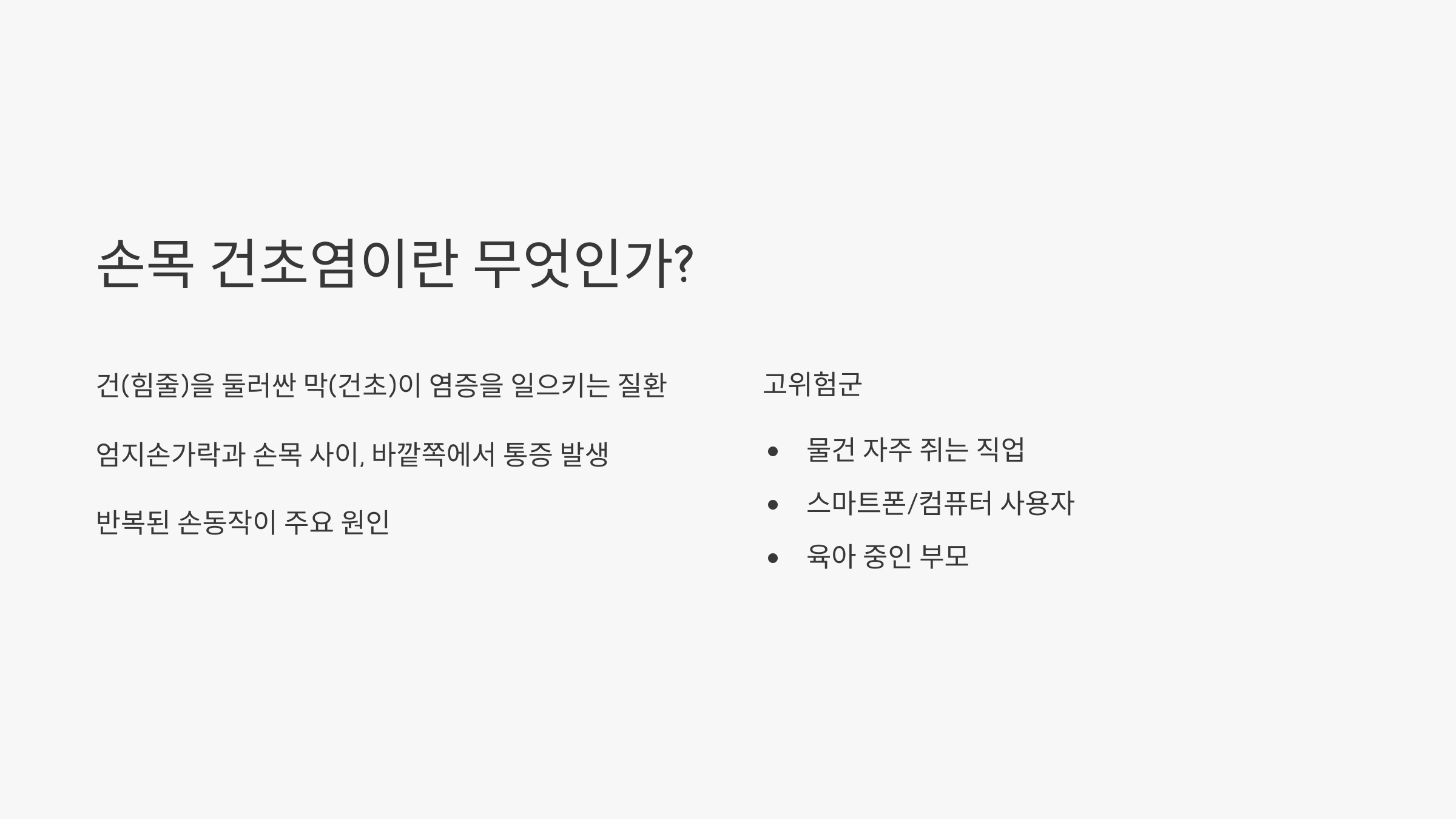 손목 건초염은 건(힘줄)을 둘러싼 막(건초)이 염증을 일으키는 질환이에요.