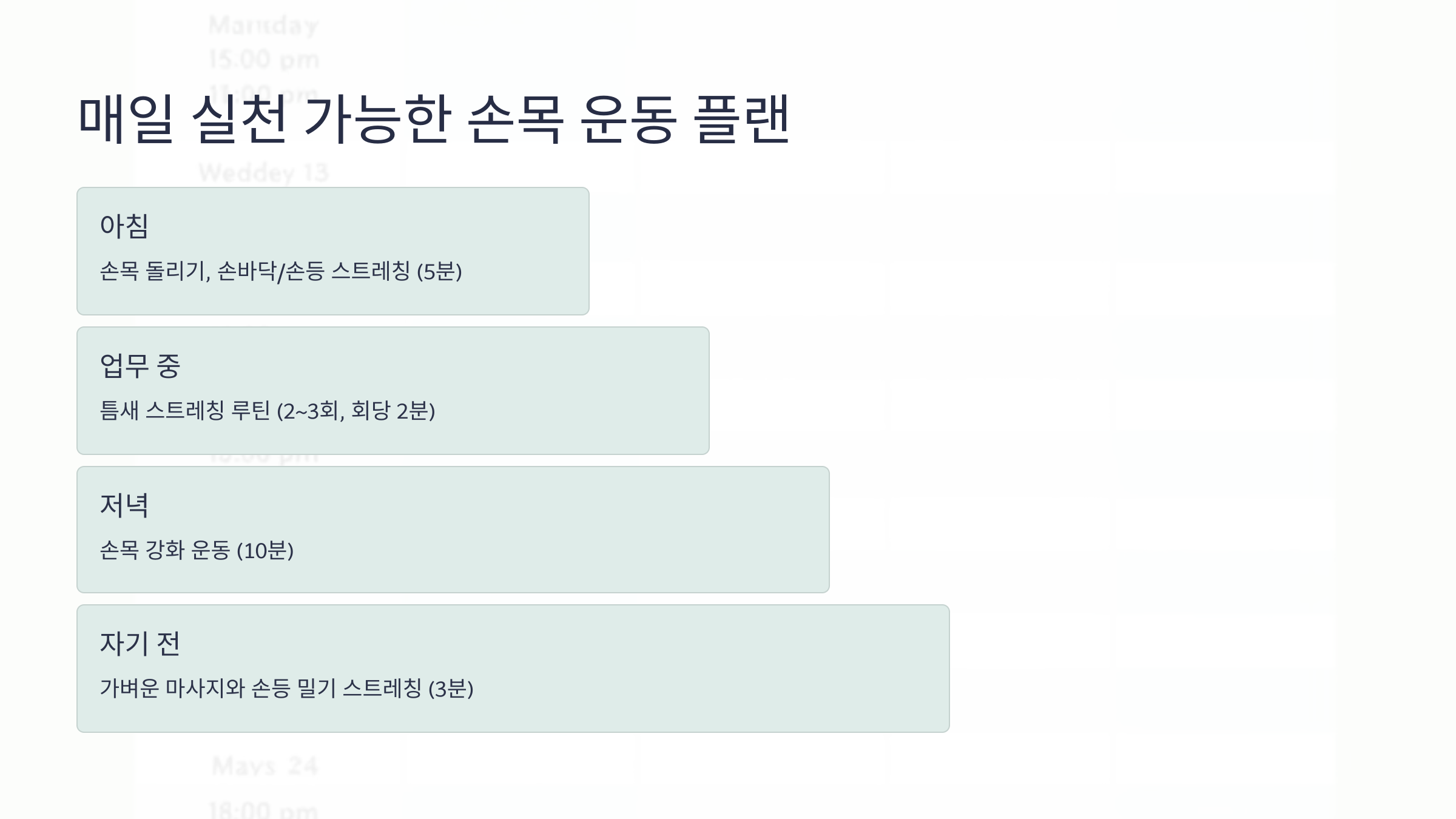 | 아침 | 손목 돌리기, 손바닥/손등 스트레칭 (5분) |