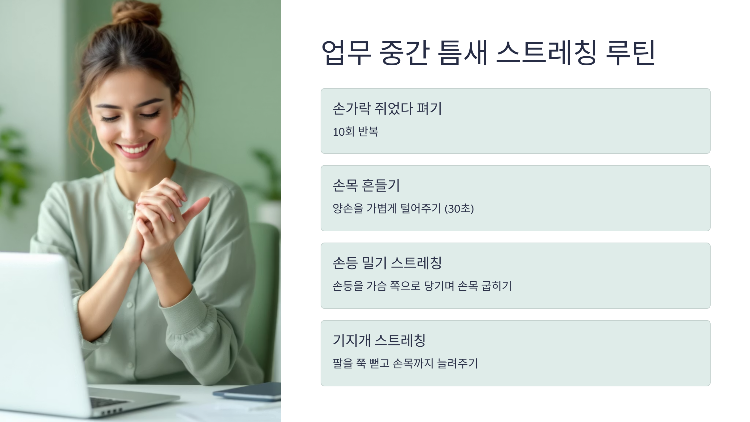 저는 알람을 45분 간격으로 맞춰두고 루틴처럼 해요! 딱 2분만 투자해도 손목이 편안해지거든요 😊