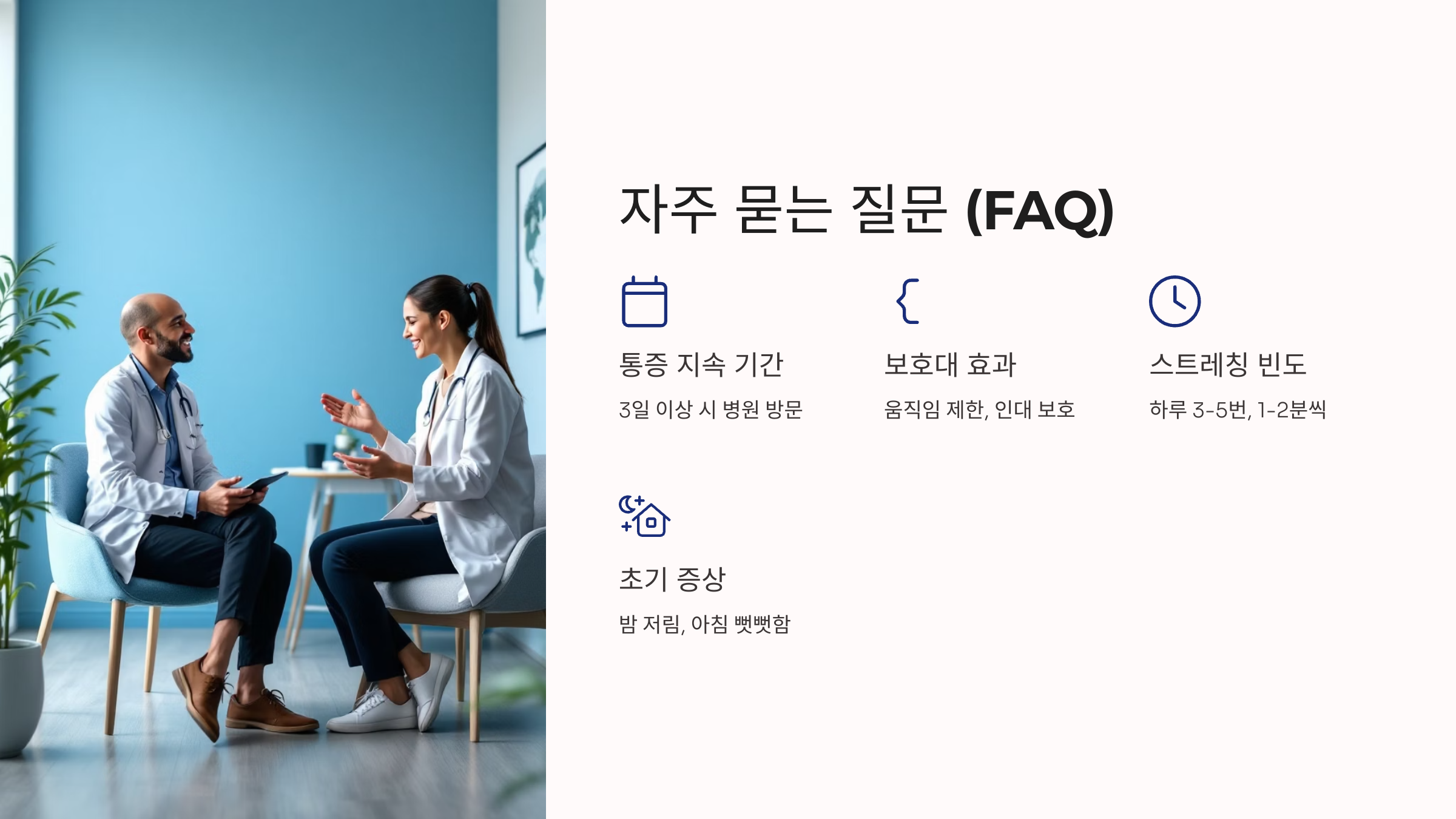 통증이 심하거나 3일 이상 지속된다면, 정형외과나 재활의학과에서 검사를 받아보시는 게 좋습니다.