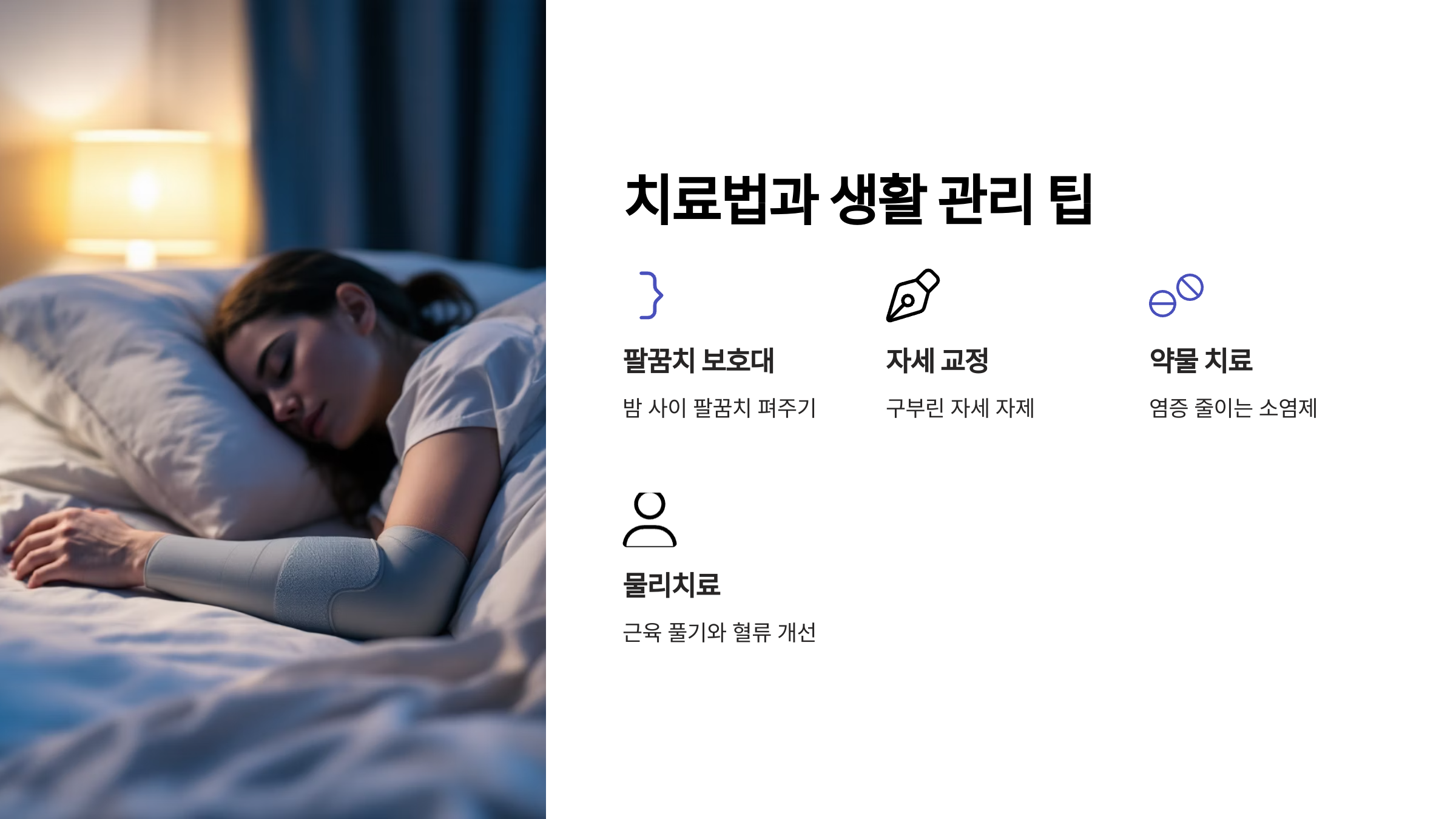 - 팔꿈치 보호대 착용: 밤 사이 팔꿈치를 펴주는 역할