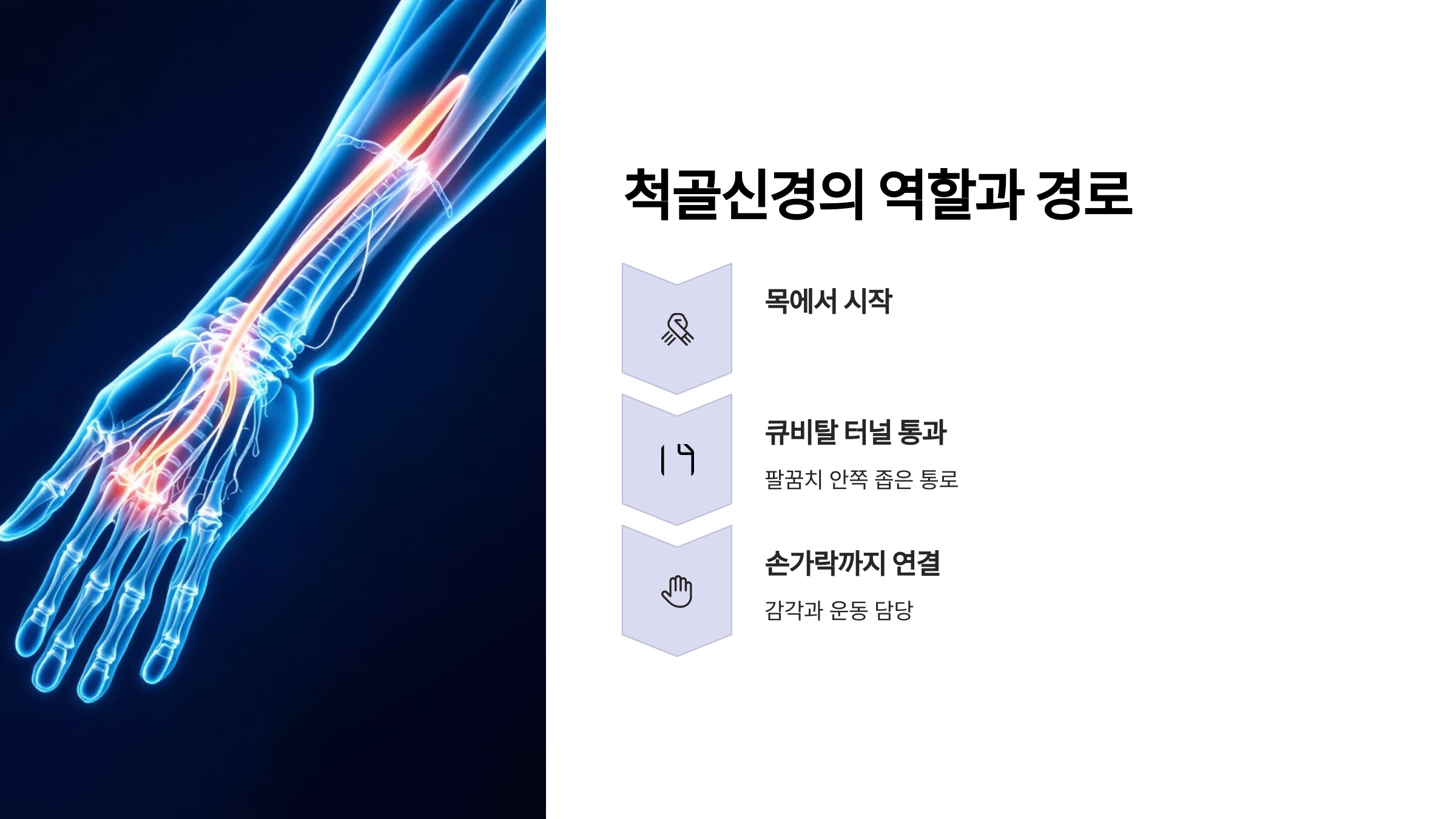 척골신경은 목에서 시작해 팔꿈치를 지나 손가락까지 이어지는 중요한 신경이에요. 특히 팔꿈치 안쪽 뼈 바로 아래의 터널(큐비탈 터널)을 지나가는데, 이 터널이 좁아지거나 외부 압력을 받으면 신경이 눌릴 수 있습니다. 이때 손저림, 감각 이상, 심하면 근육 약화까지 생길 수 있어요 😖