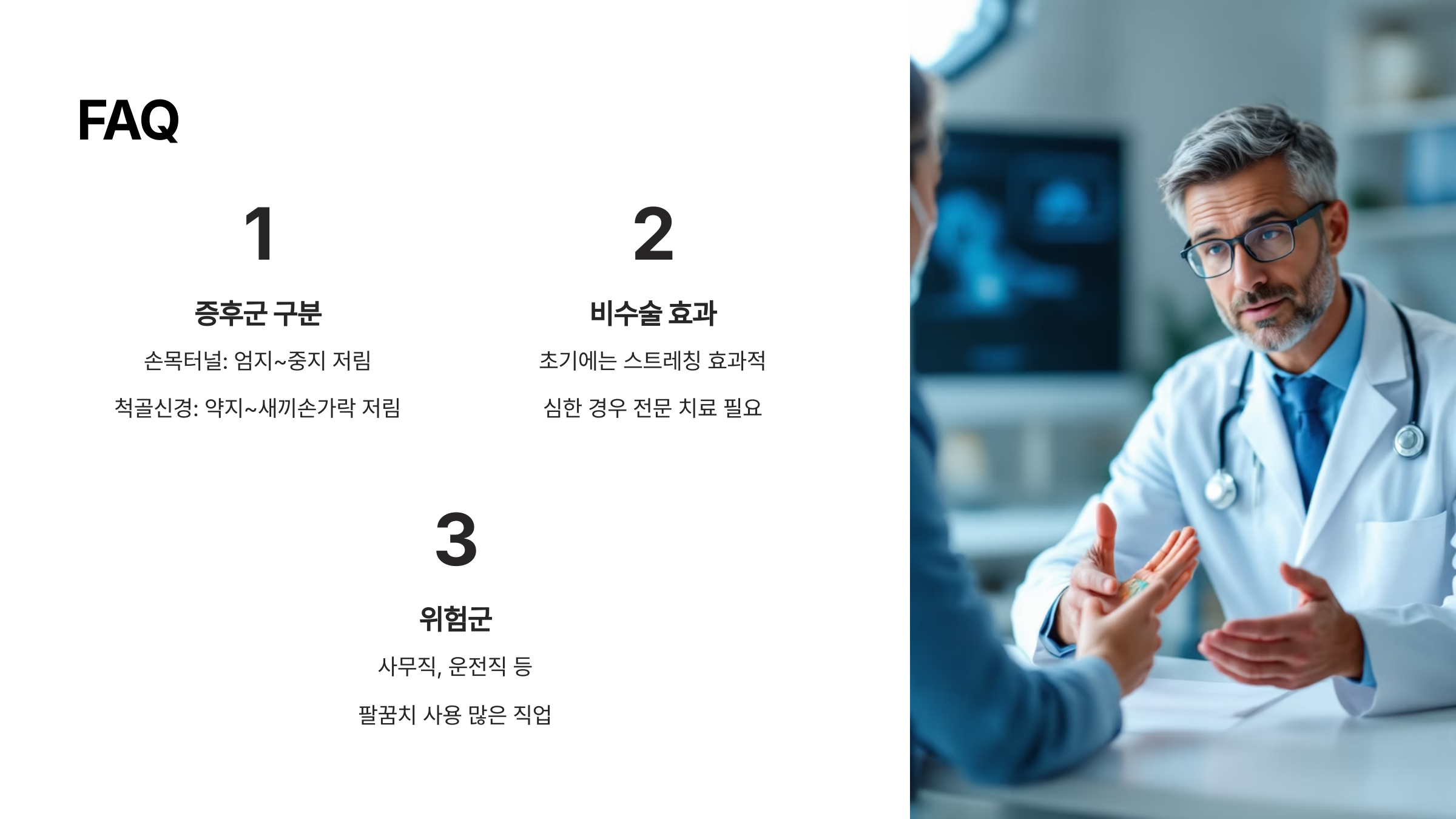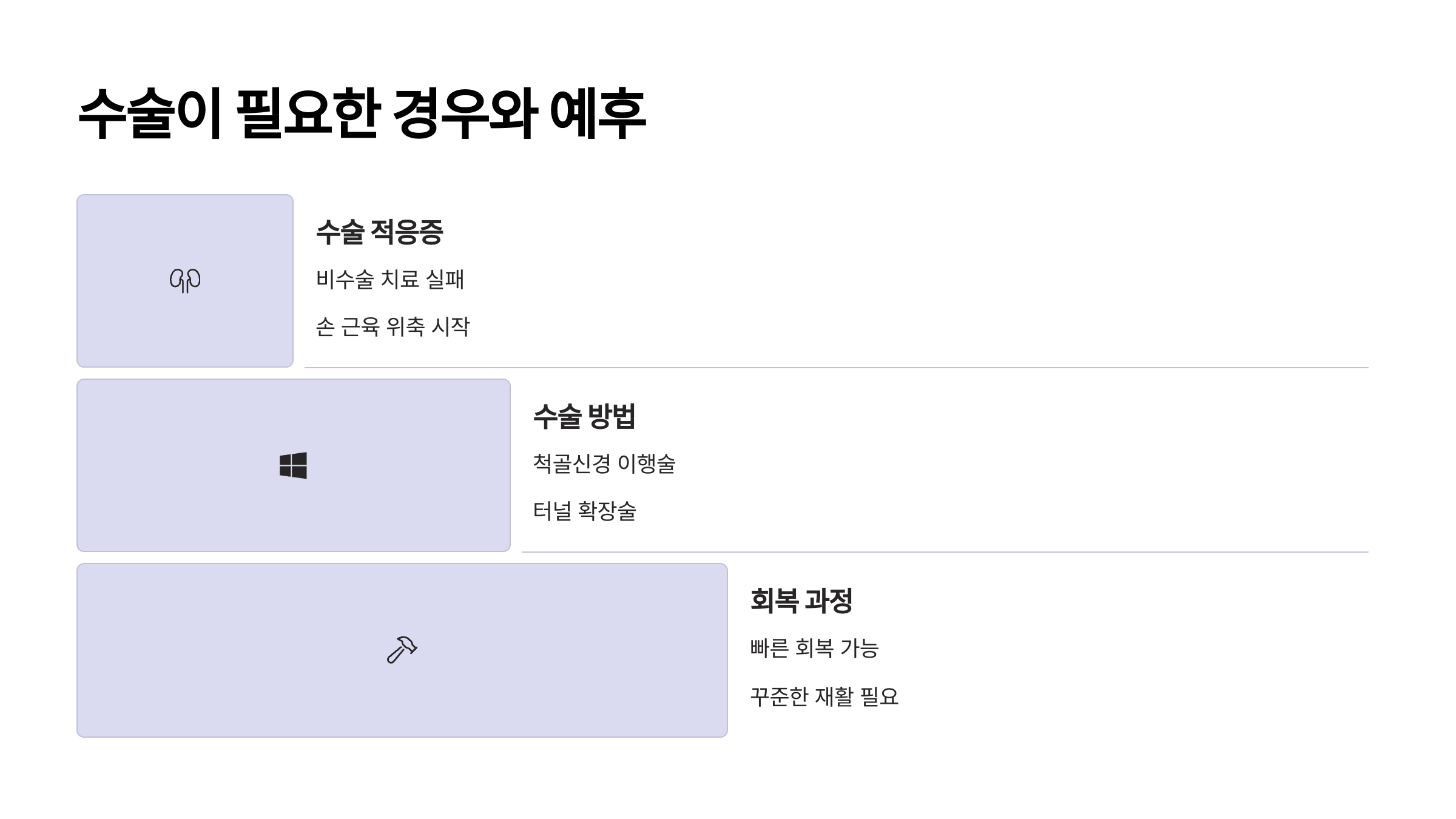 비수술 치료로도 호전이 없고, 손 근육이 위축되기 시작한다면 수술이 필요할 수 있어요.