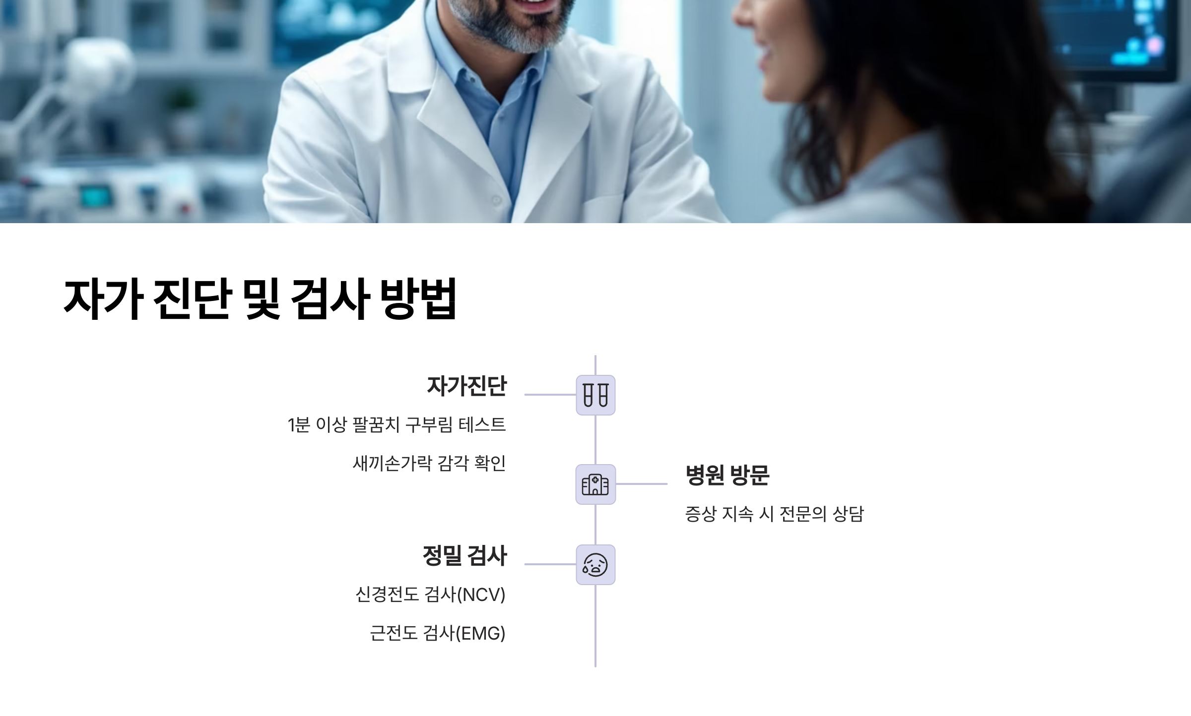 정확한 진단은 신경전도 검사(NCV), 근전도 검사(EMG) 등을 통해 진행됩니다. 병원을 방문하셔서 빠른 진단을 받는 것이 좋아요 ✅