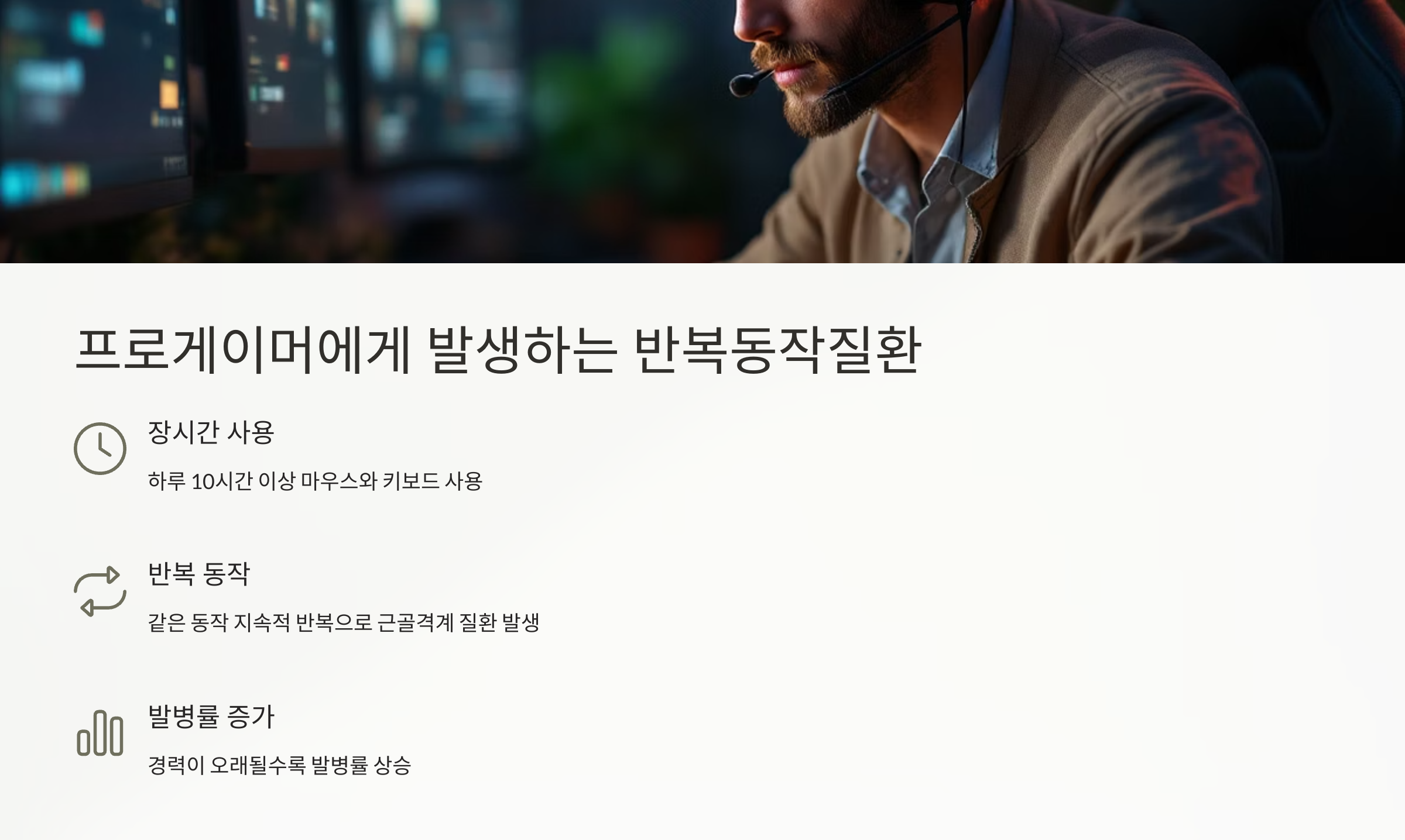 e스포츠의 세계는 체력 싸움도 중요합니다. 마우스와 키보드를 하루 10시간 이상 사용하는 프로게이머들은 반복적인 손목, 팔꿈치 사용으로 다양한 근골격계 질환에 노출되죠.