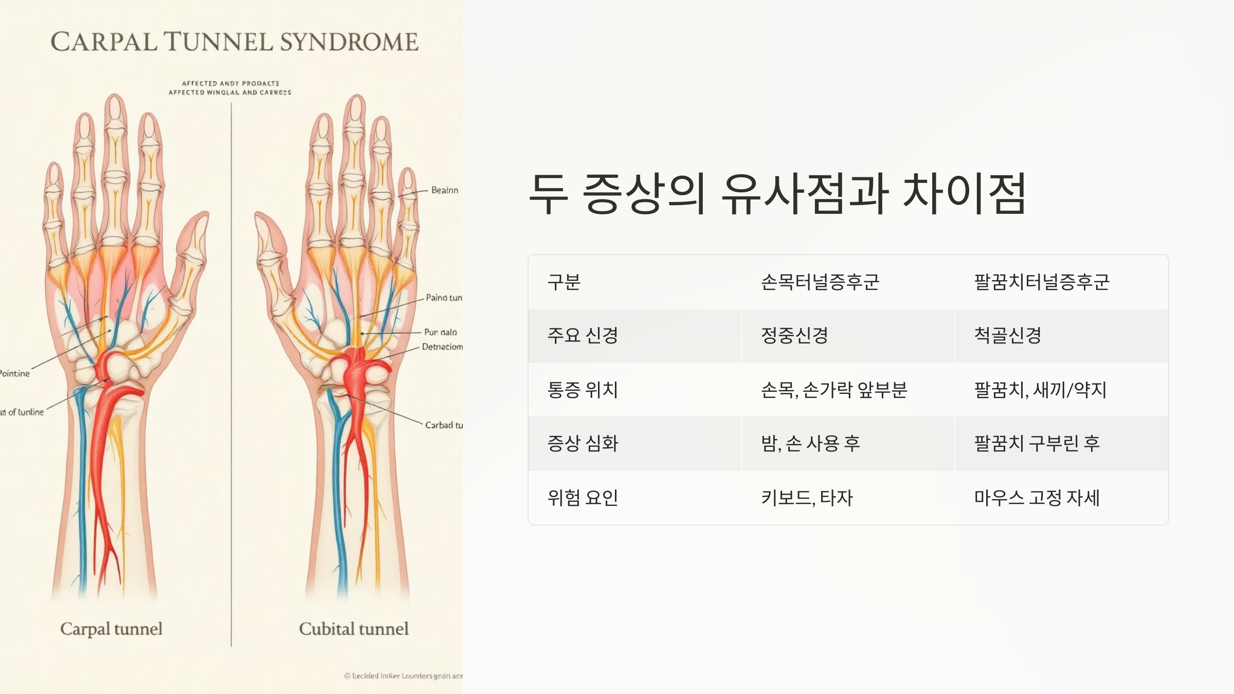 | 통증 위치 | 손목, 손가락 앞부분 | 팔꿈치, 새끼손가락/약지 |
