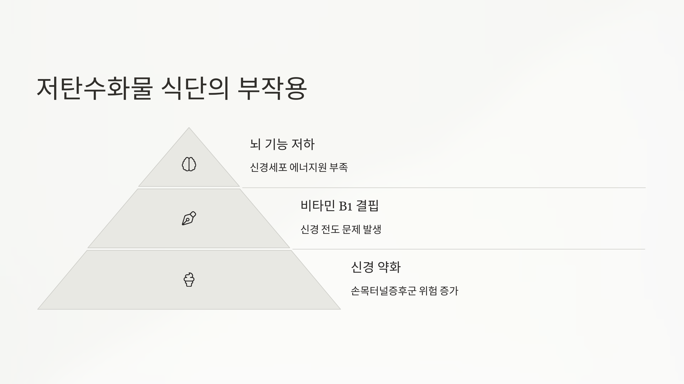 특히 비타민 B1(티아민)은 탄수화물 대사에 필수인데, 저탄수 식단은 이 비타민 섭취가 부족해질 가능성이 커요. 이로 인해 신경이 약화되고, 손목터널 같은 증상이 잘 생길 수 있죠.