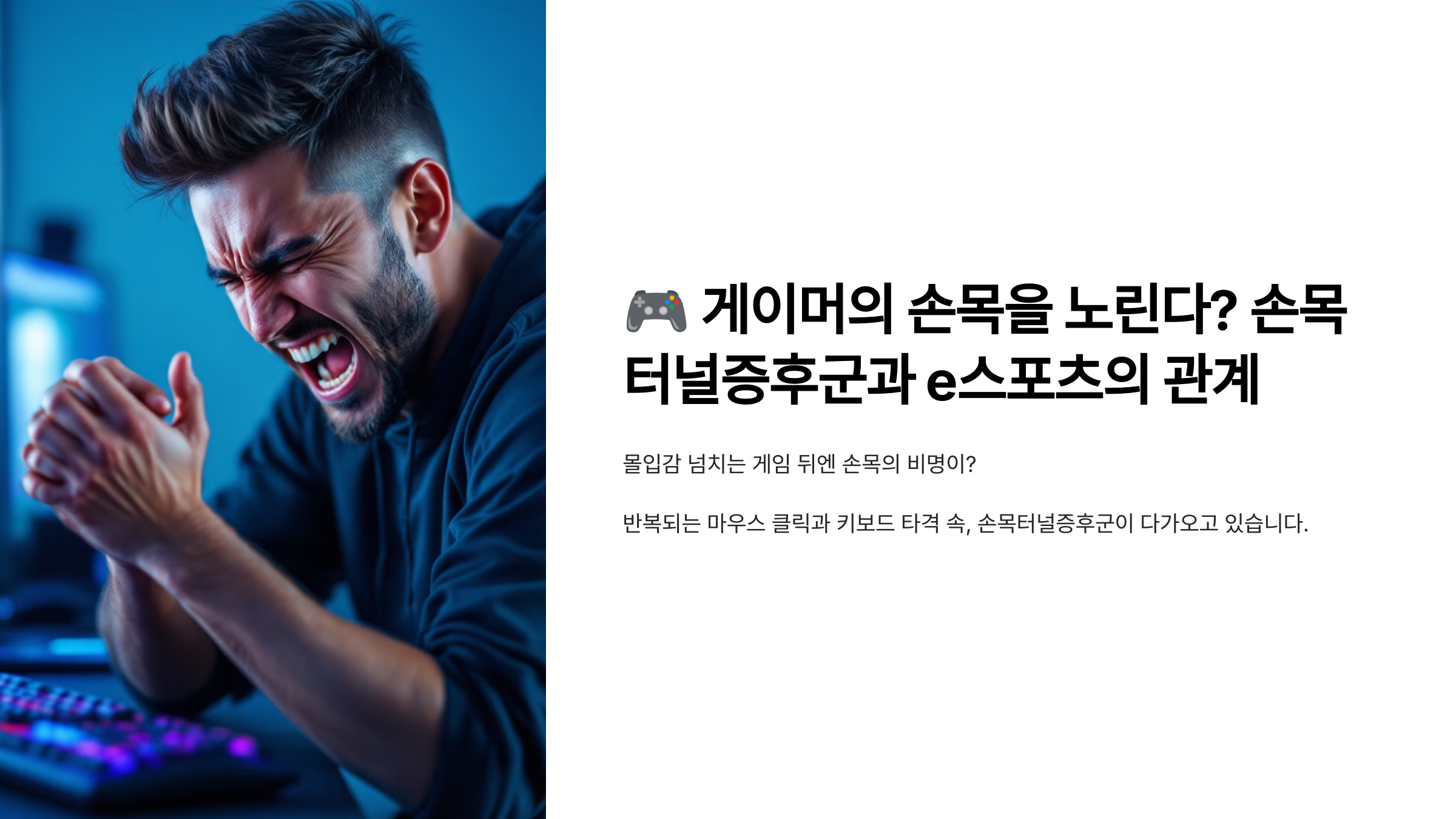 ⌨️ 몰입감 넘치는 게임 뒤엔 손목의 비명이? 반복되는 마우스 클릭과 키보드 타격 속, 통증과 저림등을 동반한 손목터널증후군이 몰래 다가오고 있습니다. 특히 e스포츠 선수를 꿈꾸는 분들, 지금부터라도 손목 건강을 챙겨야 할 때입니다!