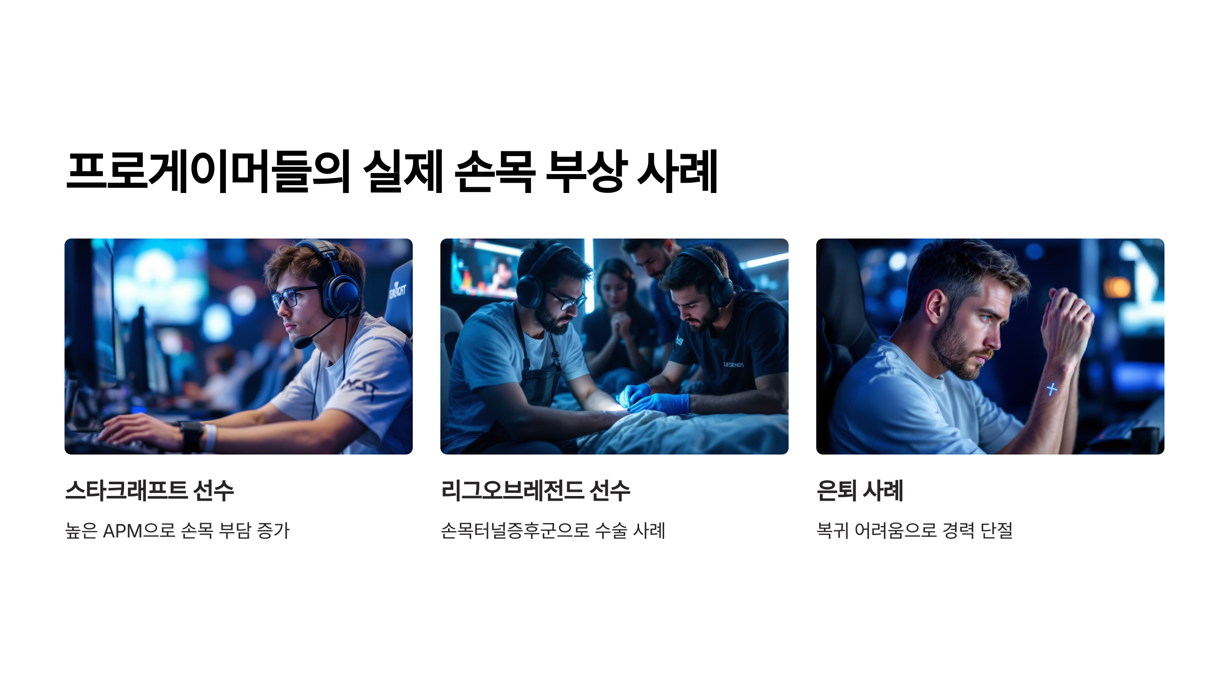 프로게이머 중에서도 손목 부상으로 경기력을 잃거나 은퇴한 사례가 꽤 많습니다. 특히 '스타크래프트'나 '리그오브레전드'와 같이 높은 APM(분당 행동수)이 요구되는 게임에서는 손목에 가해지는 부담이 매우 큽니다. 과거 유명 선수 OOO는 손목터널증후군으로 수술까지 받았고, 복귀가 힘들어지기도 했죠.